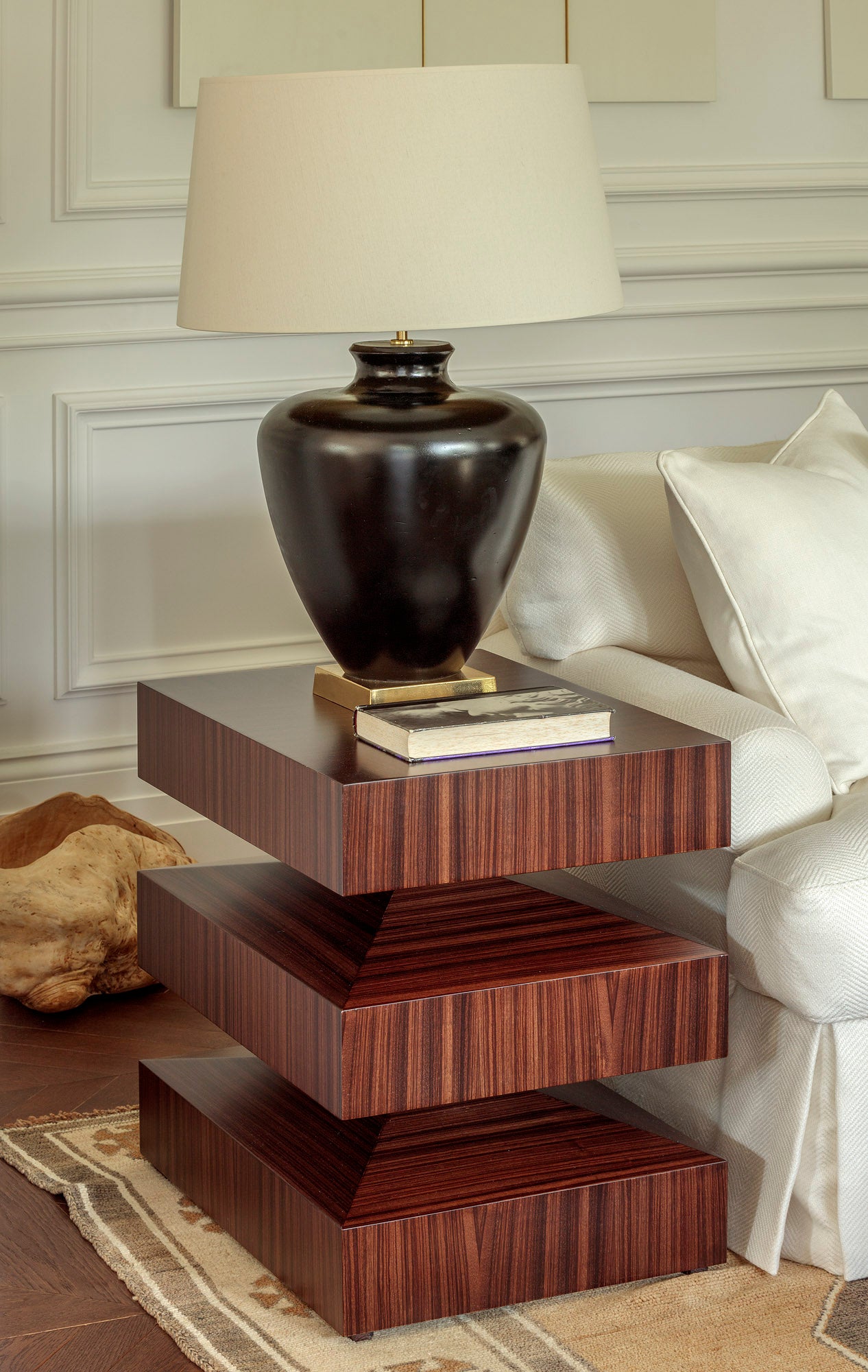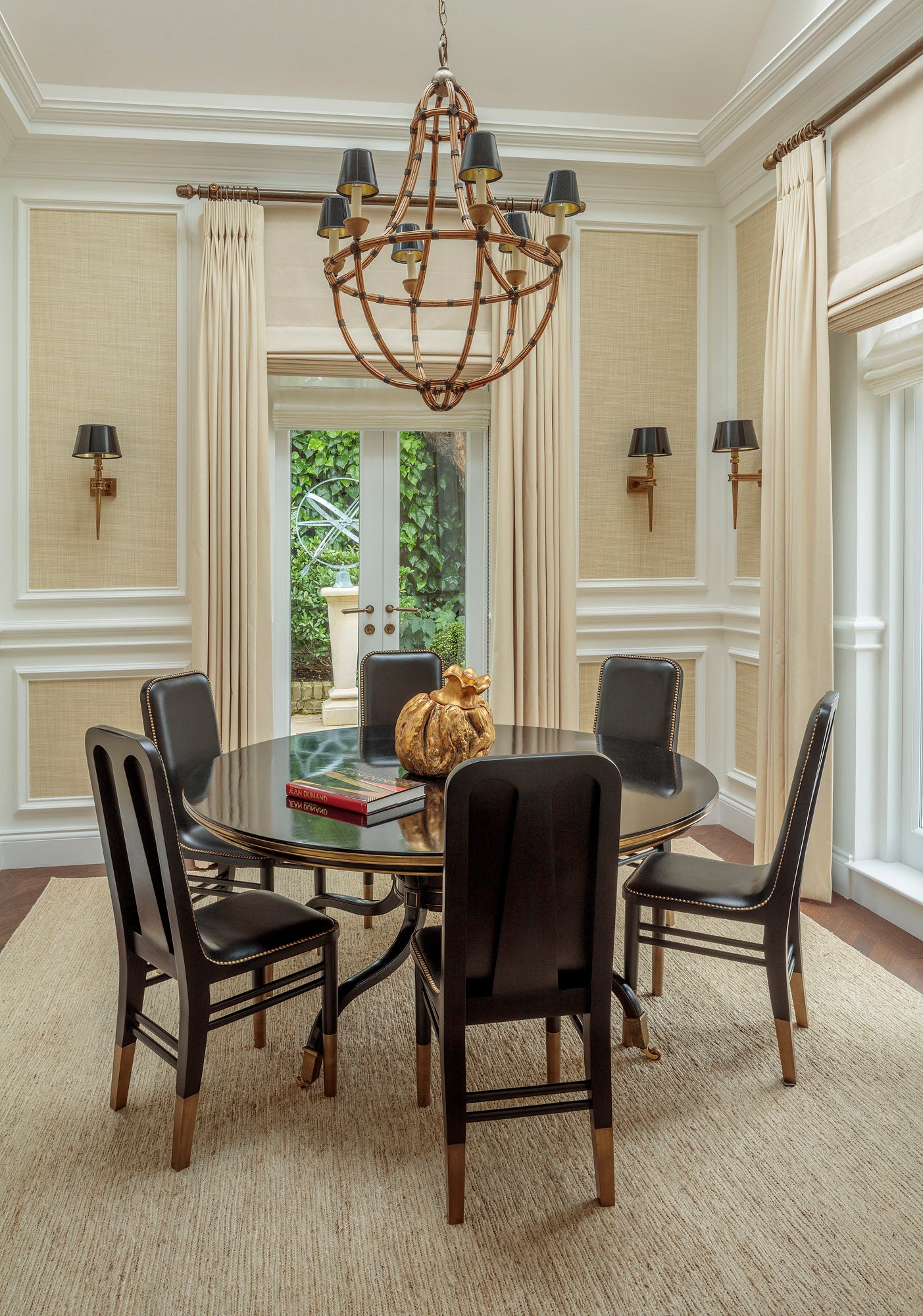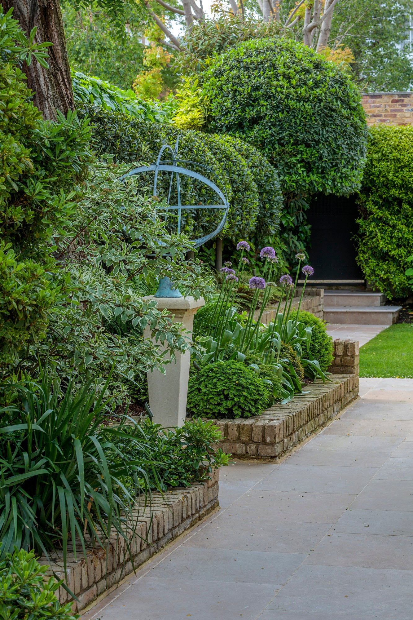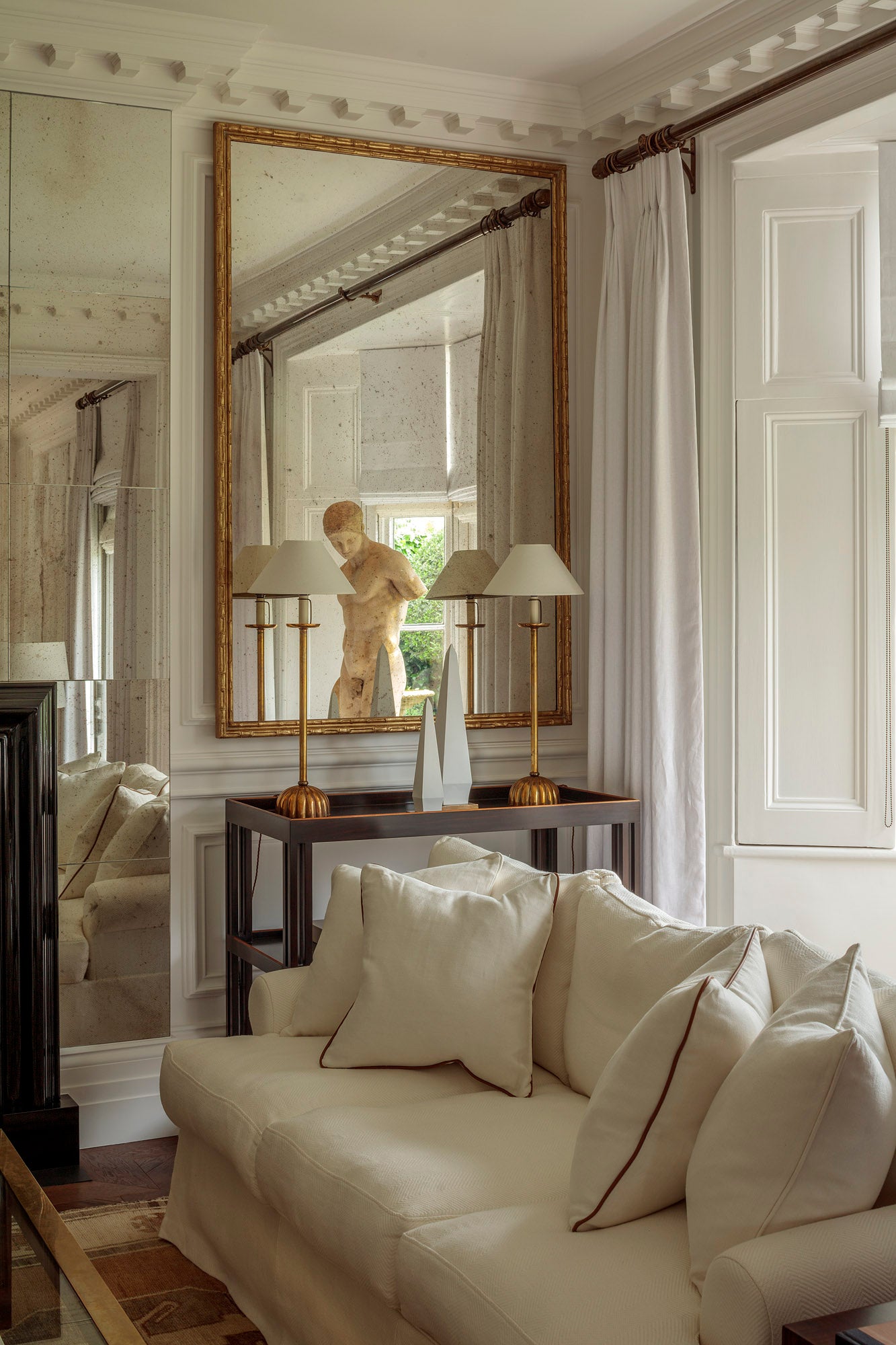 Architectural details were added to enhance the warmth—plasterwork, coving, architraves—alongside carefully chosen neutrals like his go-to paint, Not Totally White. Outdoors, what was once bricked over became a tranquil garden retreat, complete with fountains for quiet reading.