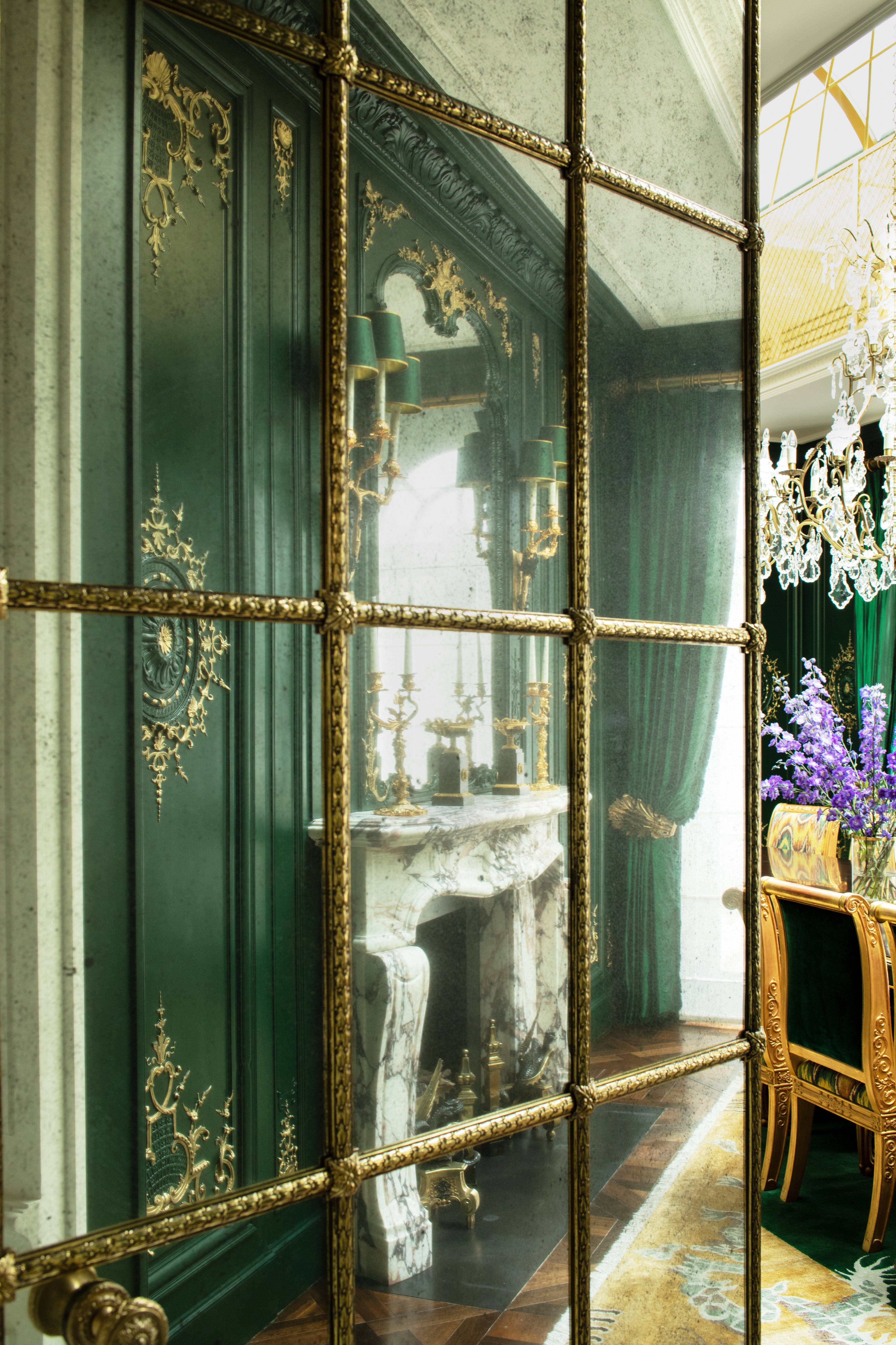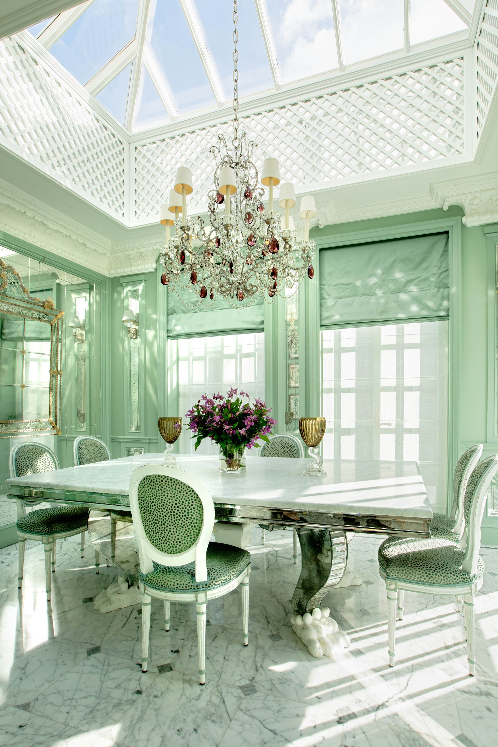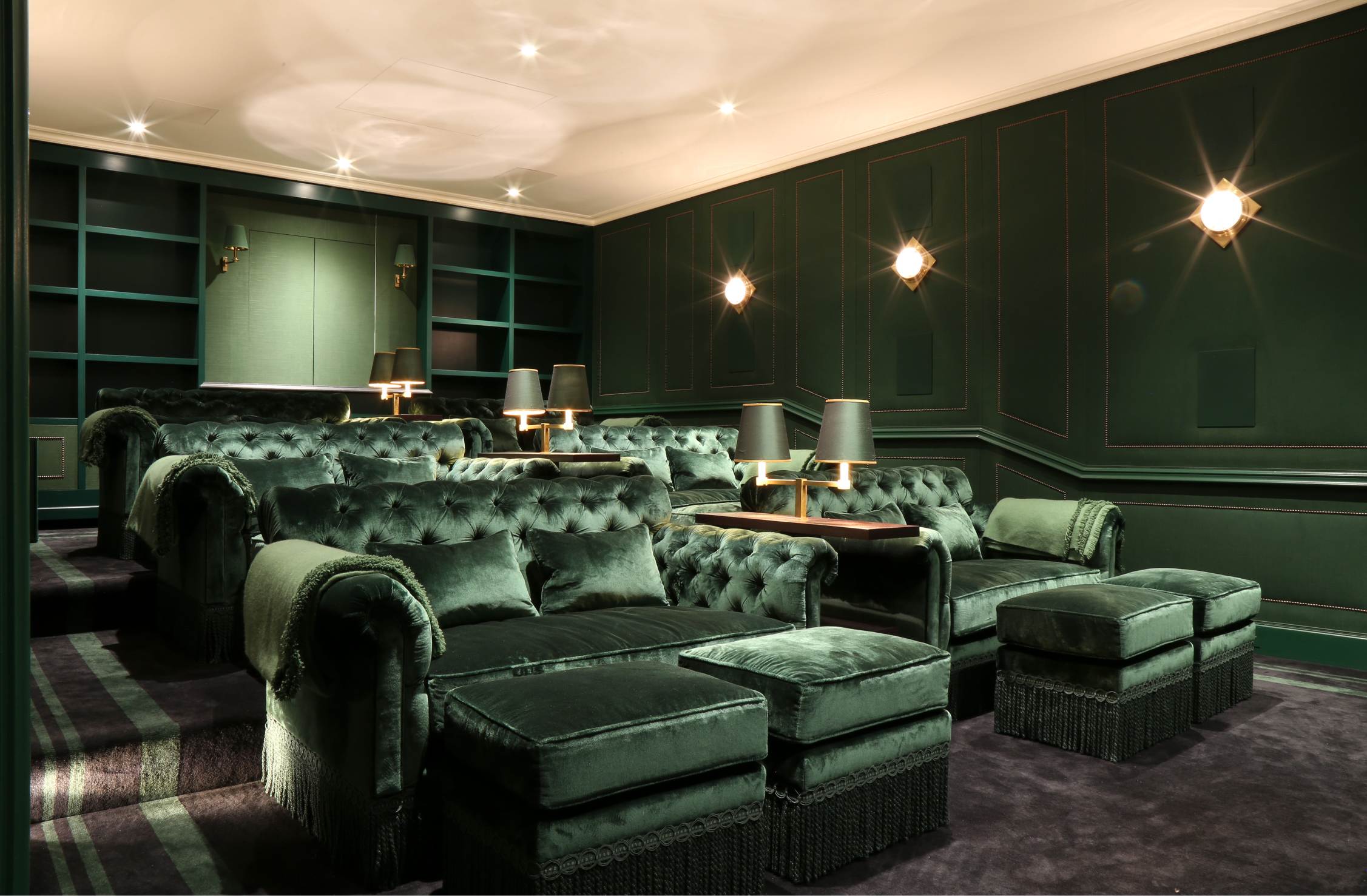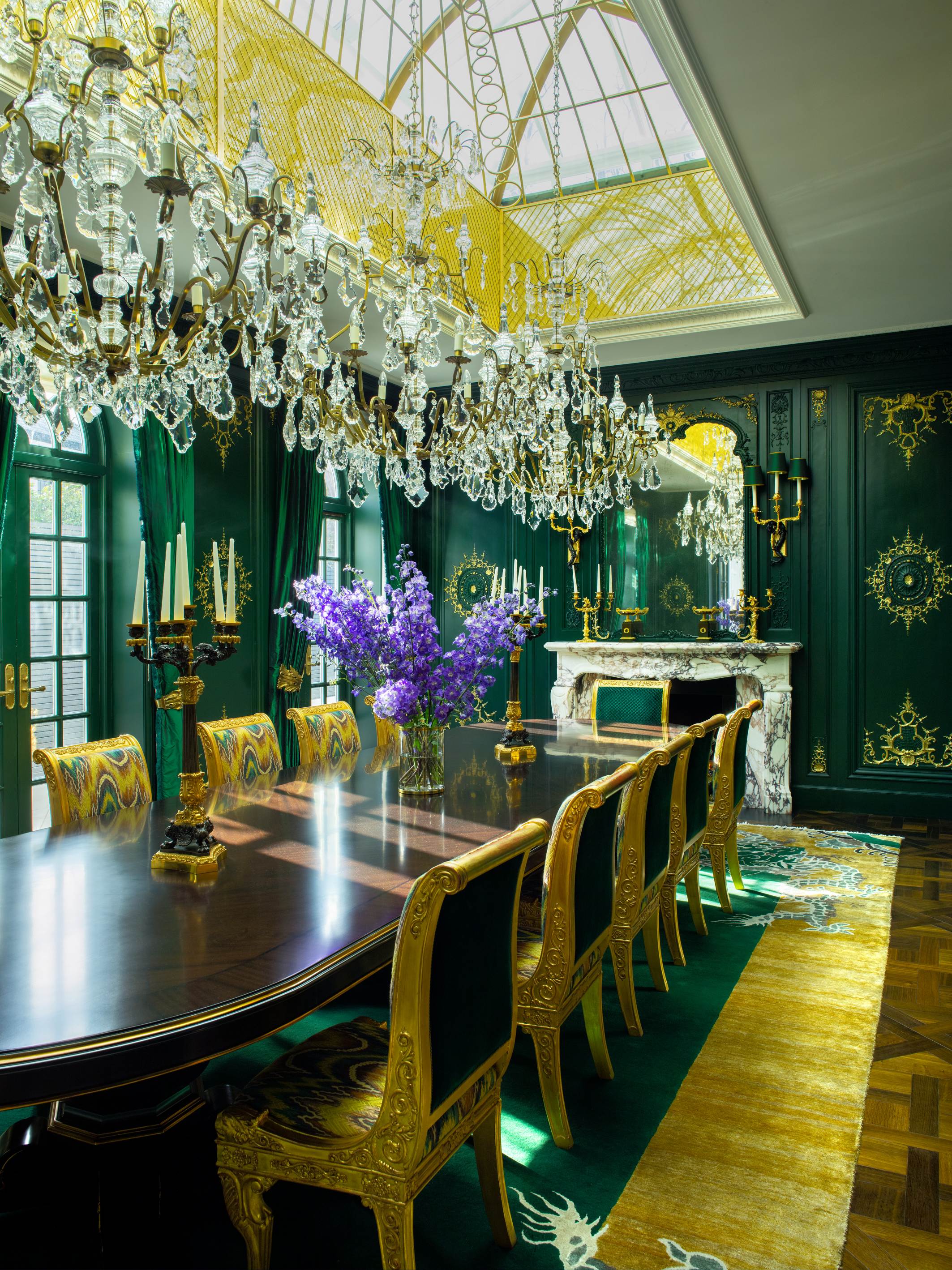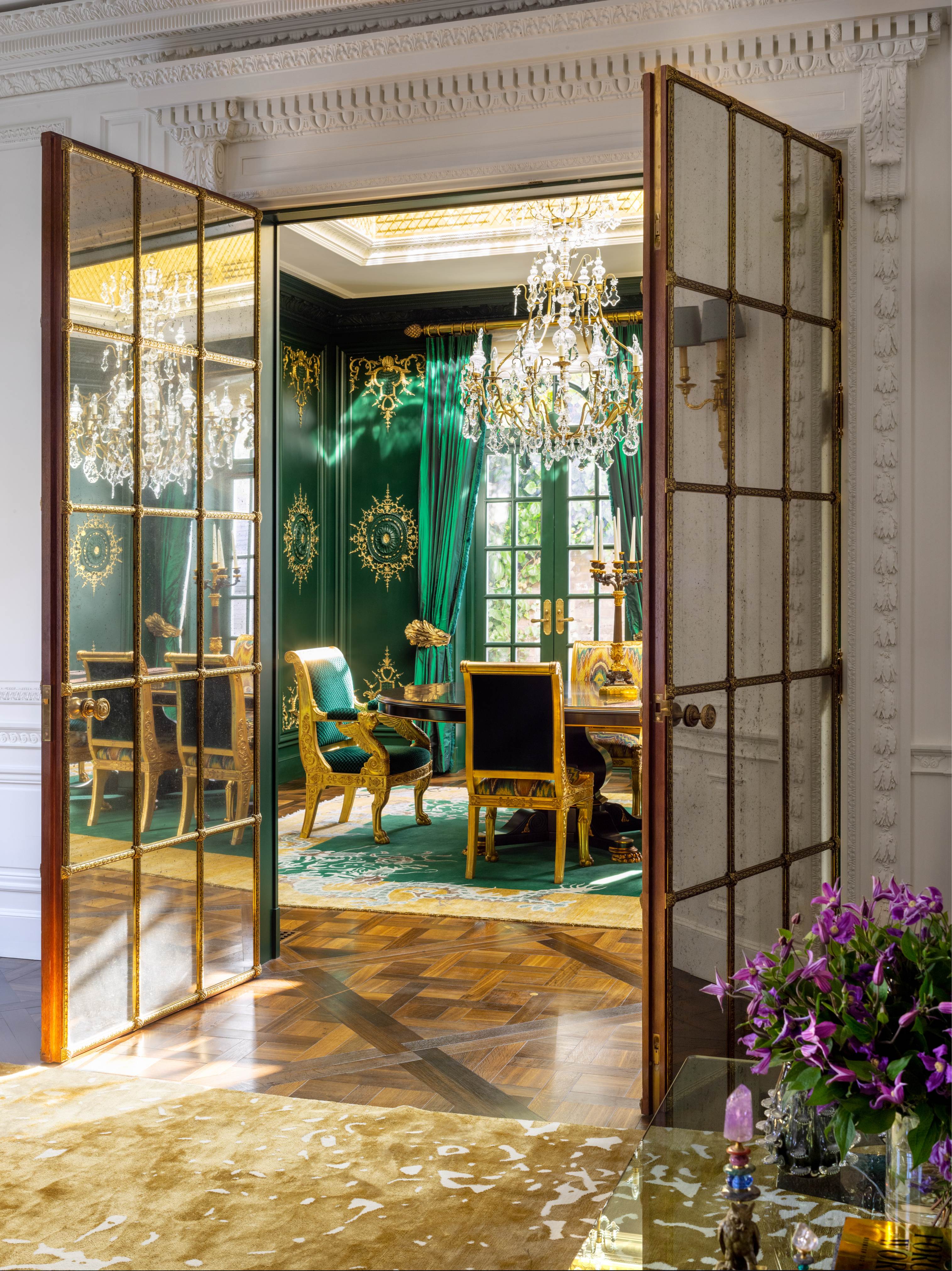 The owners of this magnificent property—a Georgian-style mansion that is one of London’s largest private residences built during the past decade—commissioned Philip Vergeylen and our Design Studio to create interiors that would reflect the grandeur of the estate. With a design brief for “more-is-more” opulence, the Studio focused on luxurious materials and exquisite craftsmanship to create bold, dramatic room settings with sumptuous details. A myriad of sources provided inspiration—the sun-splashed breakfast room recalls the pale green palette of the patisserie Ladurée; a Hong Kong restaurant created by Sir David Tang sparked the Chinese Art Deco–style games room; the library, inset with Coromandel-and-gilt panels inspired by Coco Chanel’s iconic Rue Cambon apartment, is lacquered a deep aubergine, the client’s favourite colour; and one of the four dining rooms references the deep emerald green of couturier Hubert de Givenchy’s storied drawing room in Paris. The luxurious bedroom suites feature dazzling bathrooms, tufted velvet sofas beckon in the screening room, and the pristine indoor pool is steps from an elegant sitting area furnished in classic rattan and a crisp blue-and-white chinoiserie print.