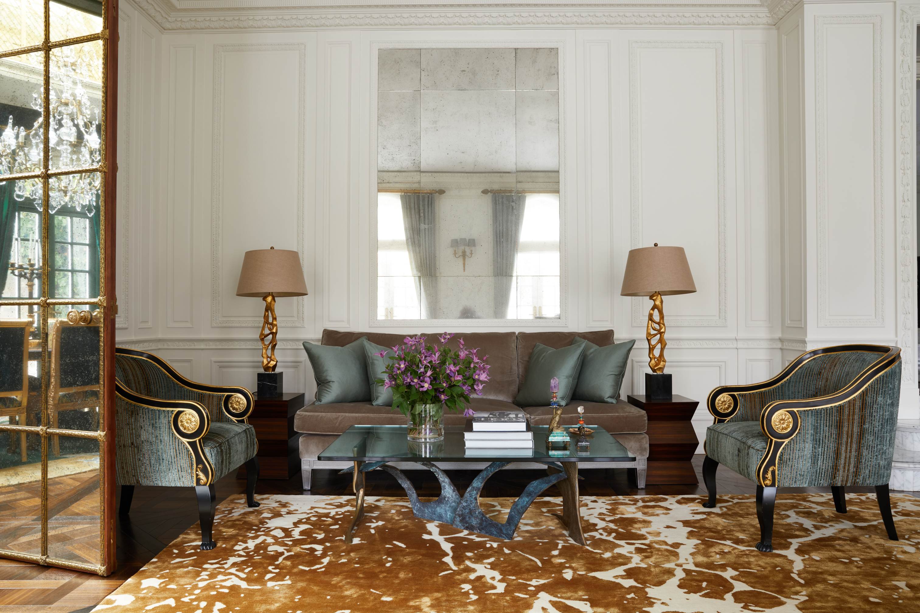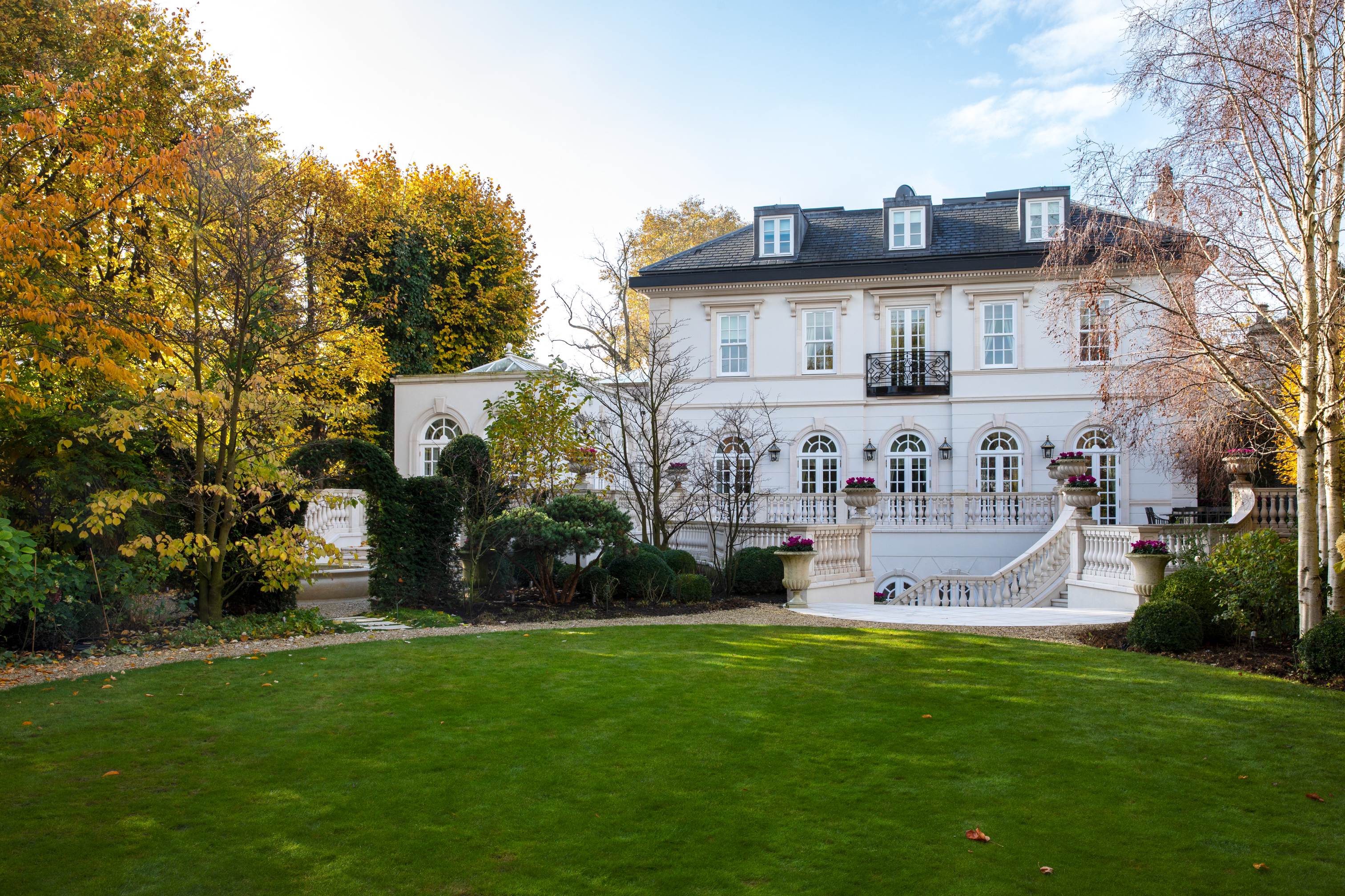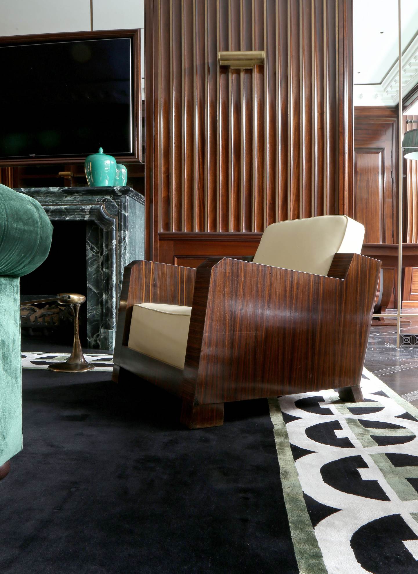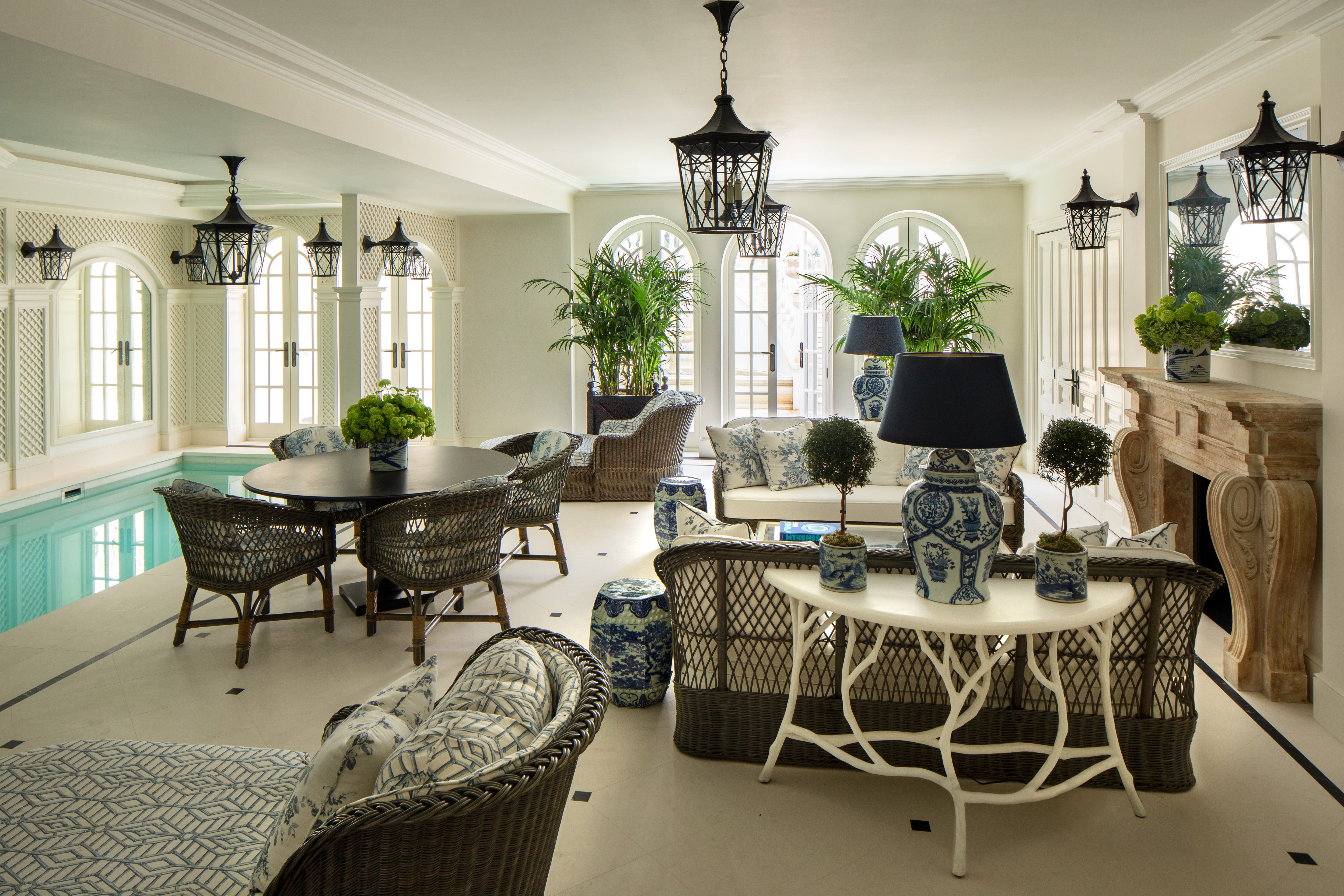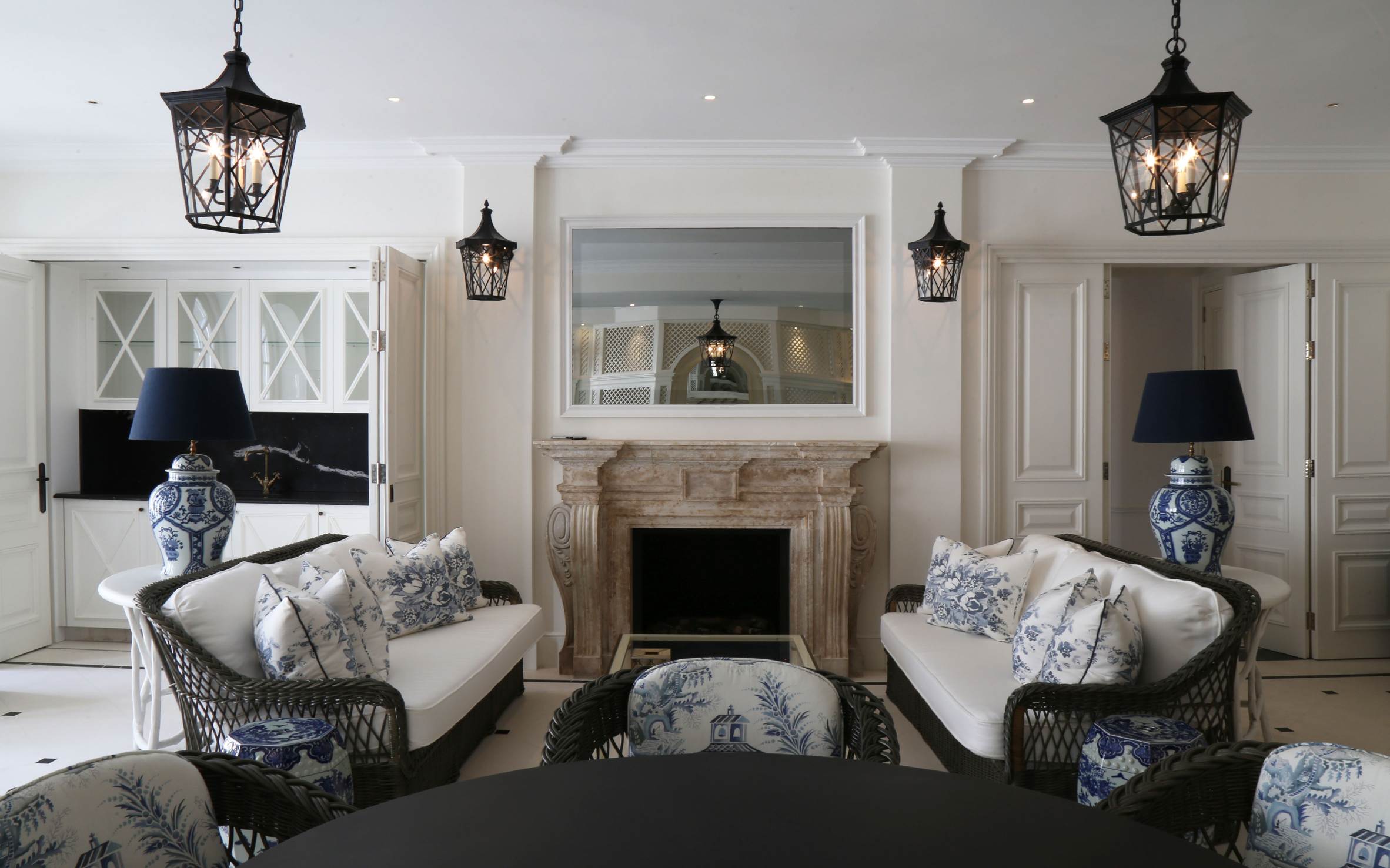 The owners of this magnificent property—a Georgian-style mansion that is one of London’s largest private residences built during the past decade—commissioned Philip Vergeylen and our Design Studio to create interiors that would reflect the grandeur of the estate. With a design brief for “more-is-more” opulence, the Studio focused on luxurious materials and exquisite craftsmanship to create bold, dramatic room settings with sumptuous details. A myriad of sources provided inspiration—the sun-splashed breakfast room recalls the pale green palette of the patisserie Ladurée; a Hong Kong restaurant created by Sir David Tang sparked the Chinese Art Deco–style games room; the library, inset with Coromandel-and-gilt panels inspired by Coco Chanel’s iconic Rue Cambon apartment, is lacquered a deep aubergine, the client’s favourite colour; and one of the four dining rooms references the deep emerald green of couturier Hubert de Givenchy’s storied drawing room in Paris. The luxurious bedroom suites feature dazzling bathrooms, tufted velvet sofas beckon in the screening room, and the pristine indoor pool is steps from an elegant sitting area furnished in classic rattan and a crisp blue-and-white chinoiserie print.