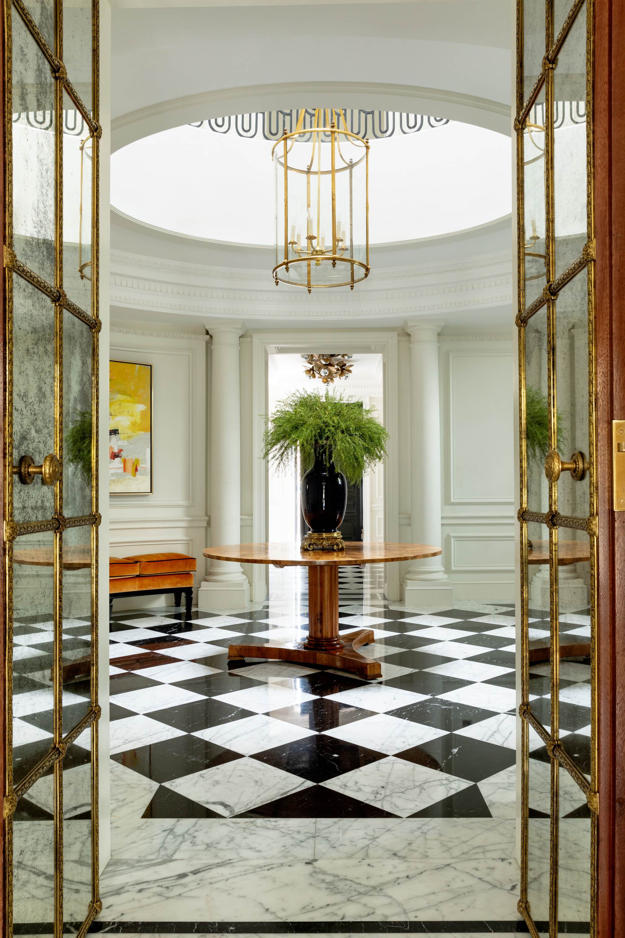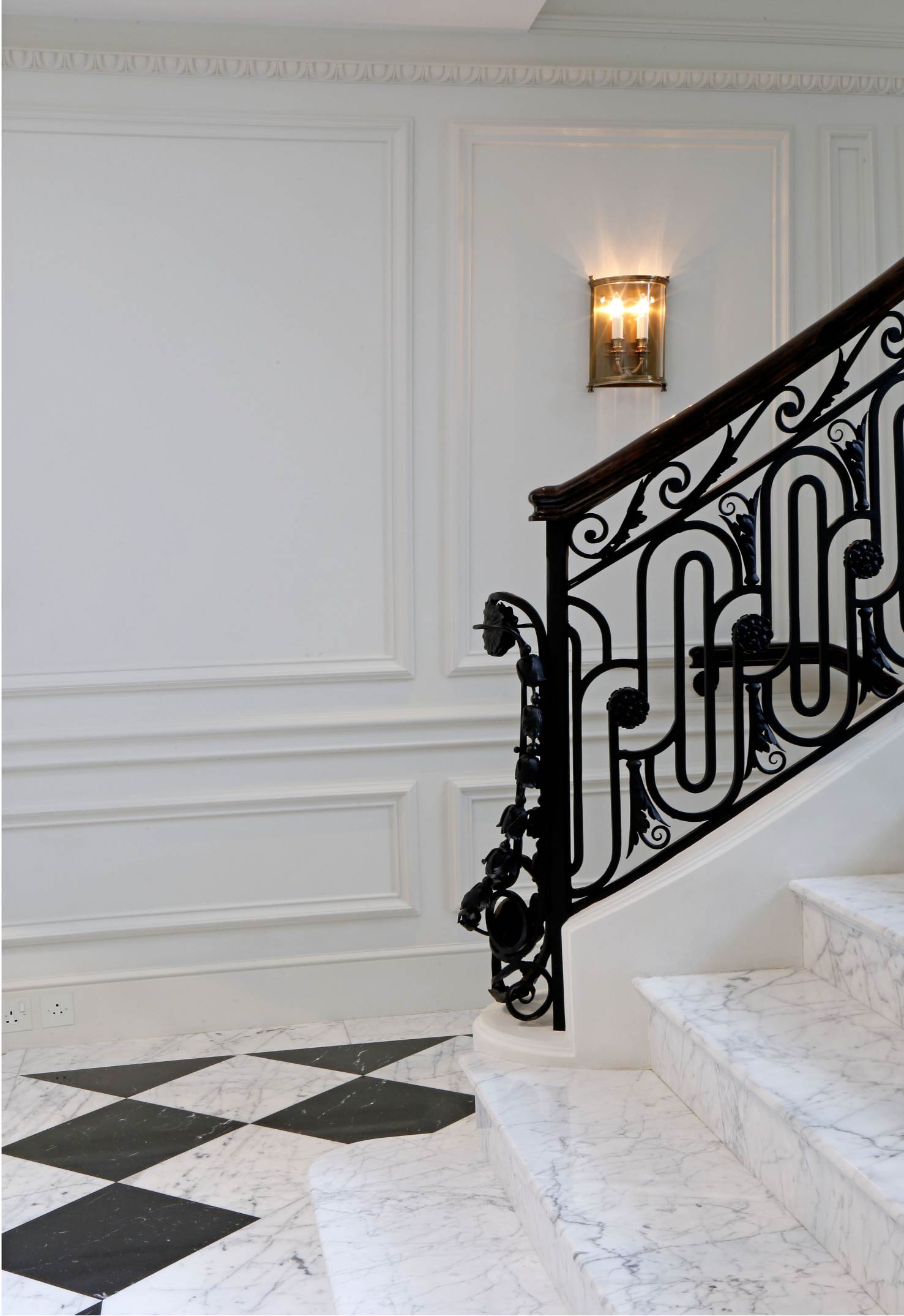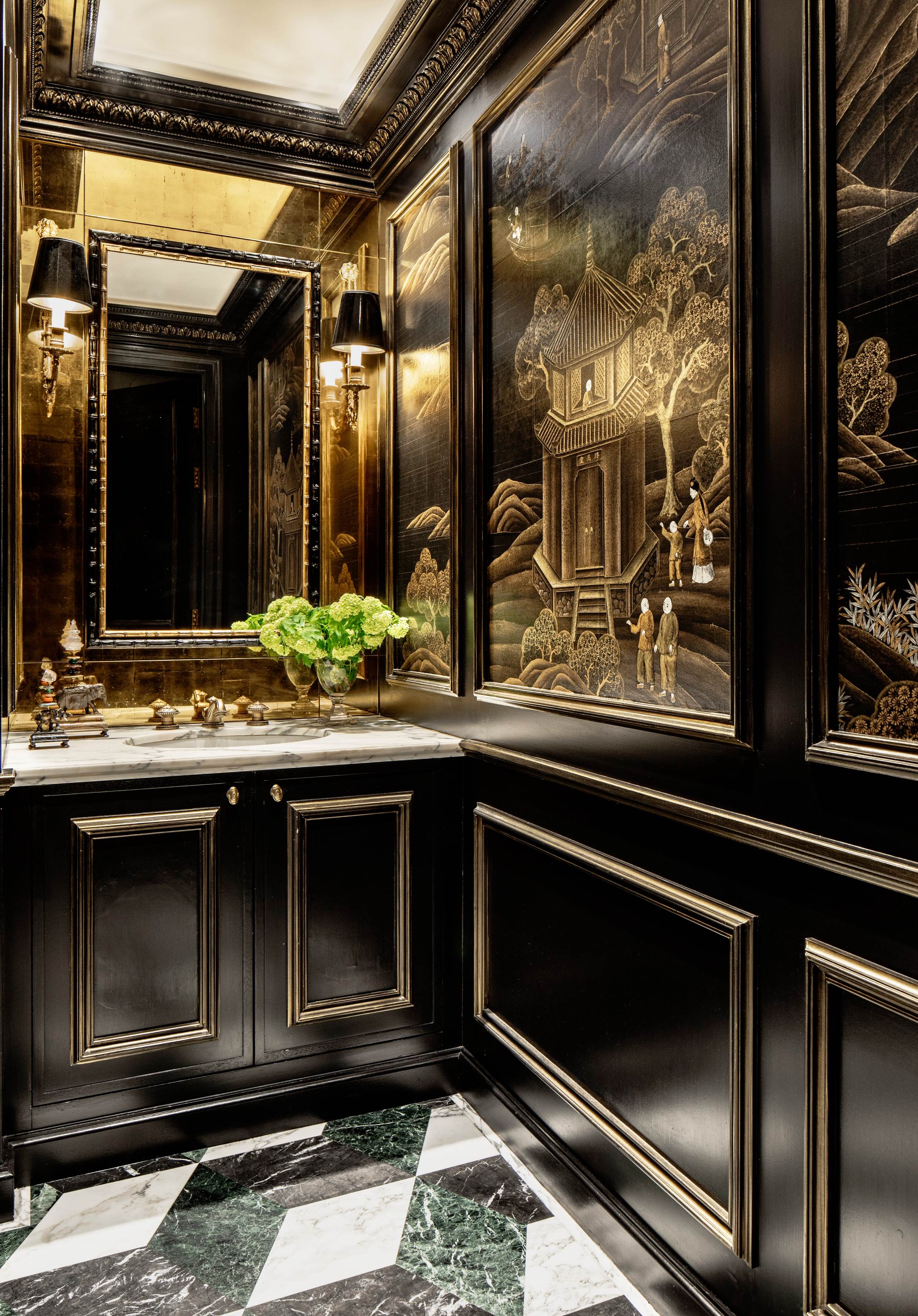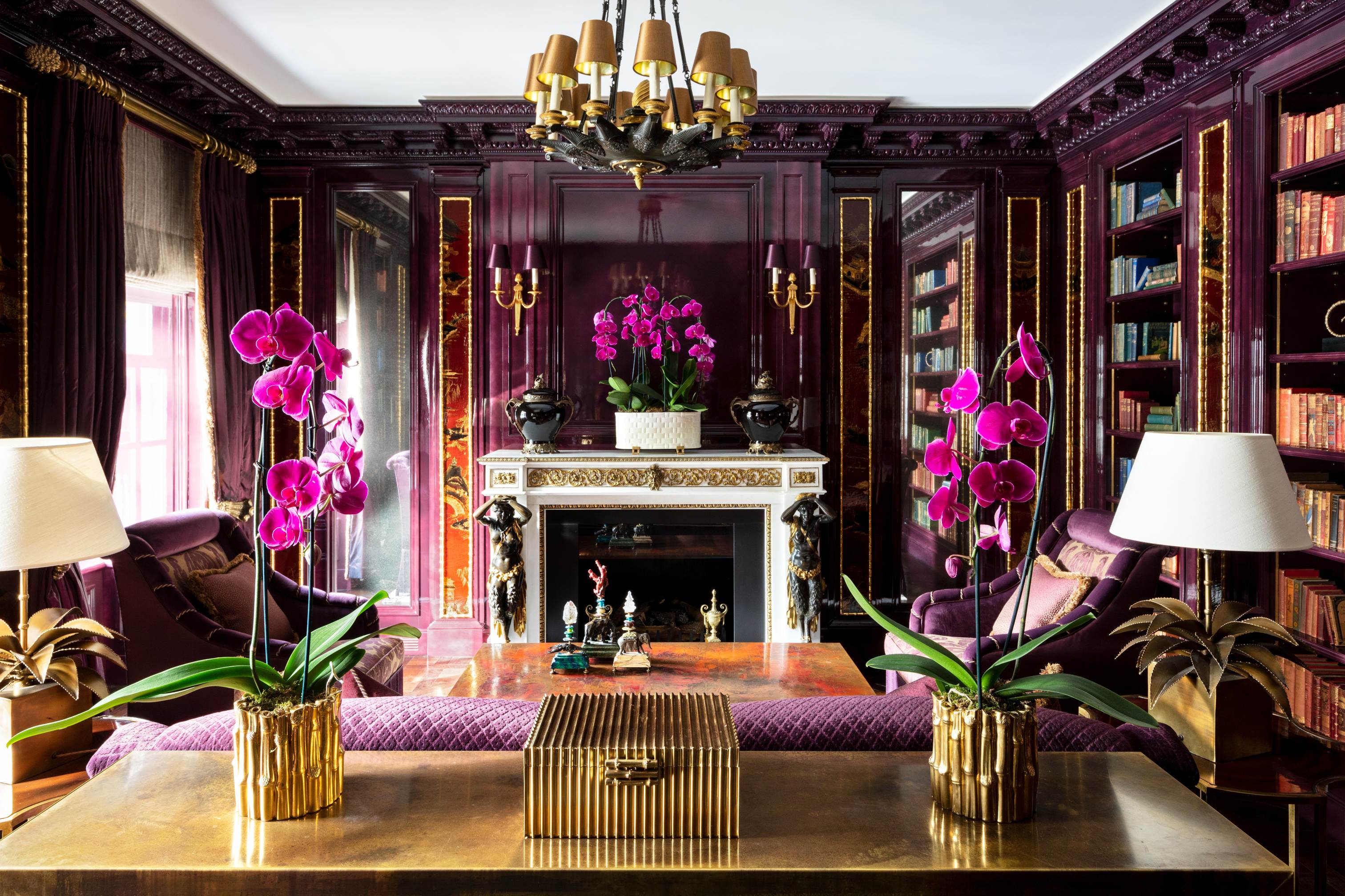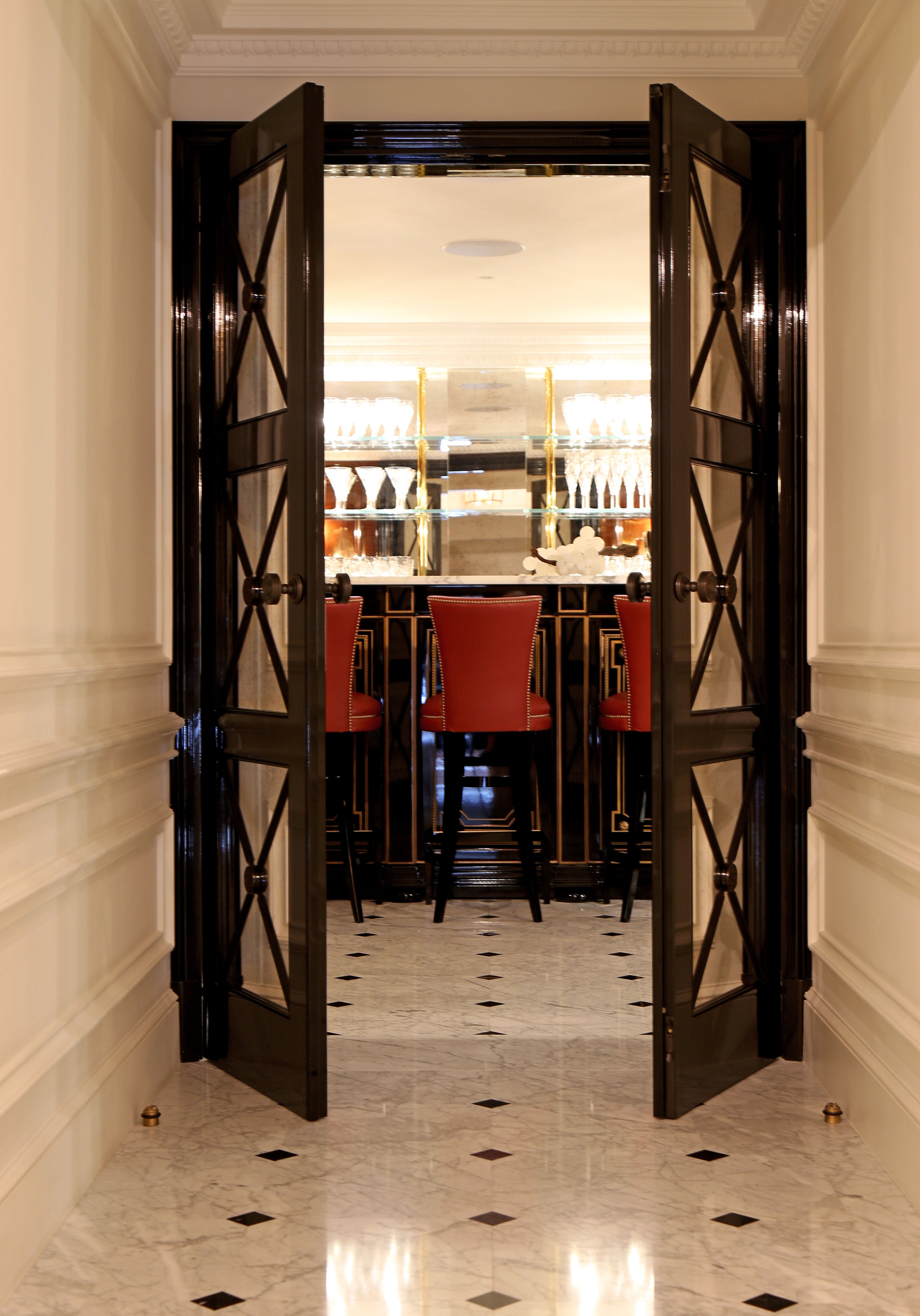 The owners of this magnificent property—a Georgian-style mansion that is one of London’s largest private residences built during the past decade—commissioned Philip Vergeylen and our Design Studio to create interiors that would reflect the grandeur of the estate. With a design brief for “more-is-more” opulence, the Studio focused on luxurious materials and exquisite craftsmanship to create bold, dramatic room settings with sumptuous details. A myriad of sources provided inspiration—the sun-splashed breakfast room recalls the pale green palette of the patisserie Ladurée; a Hong Kong restaurant created by Sir David Tang sparked the Chinese Art Deco–style games room; the library, inset with Coromandel-and-gilt panels inspired by Coco Chanel’s iconic Rue Cambon apartment, is lacquered a deep aubergine, the client’s favourite colour; and one of the four dining rooms references the deep emerald green of couturier Hubert de Givenchy’s storied drawing room in Paris. The luxurious bedroom suites feature dazzling bathrooms, tufted velvet sofas beckon in the screening room, and the pristine indoor pool is steps from an elegant sitting area furnished in classic rattan and a crisp blue-and-white chinoiserie print.