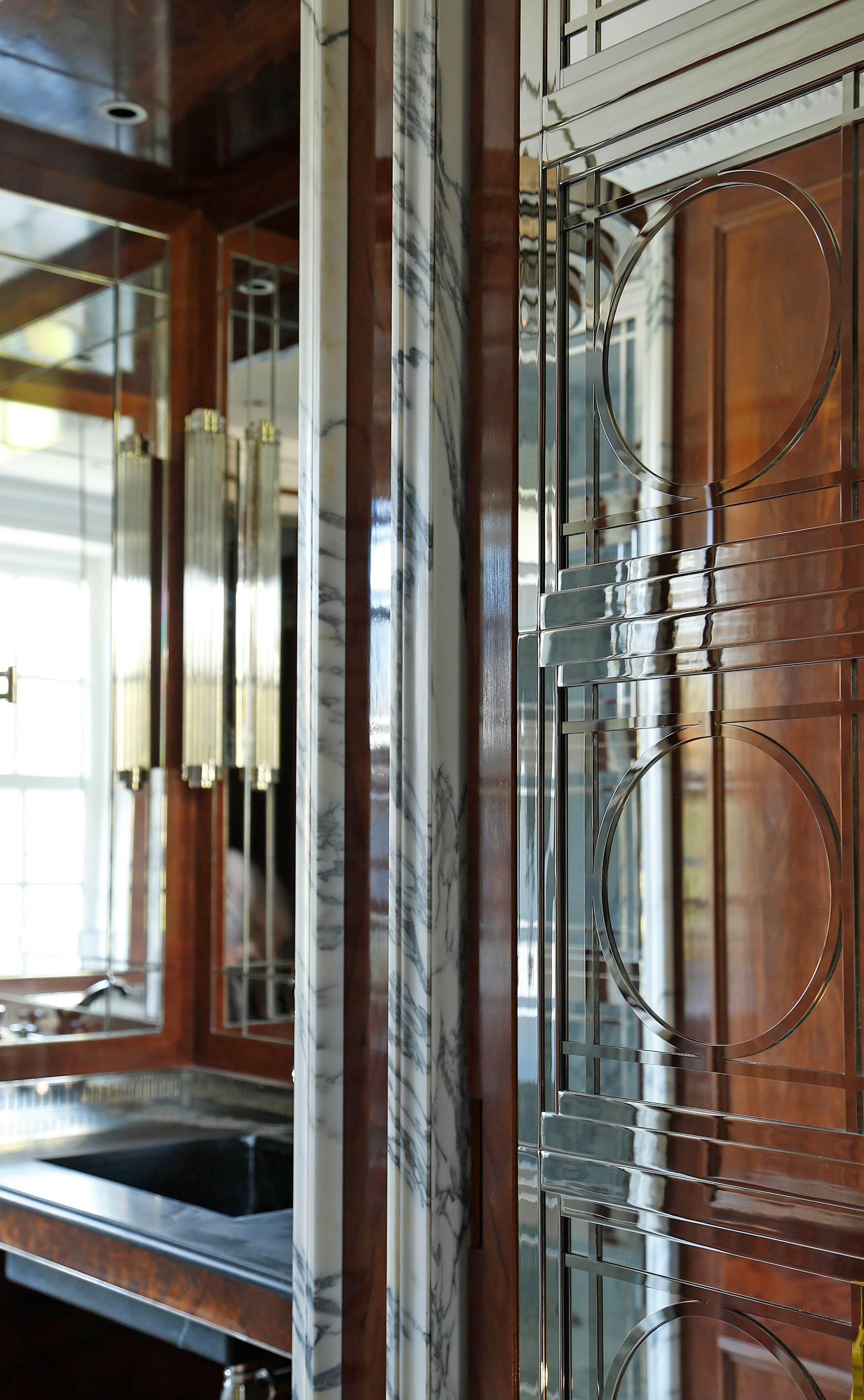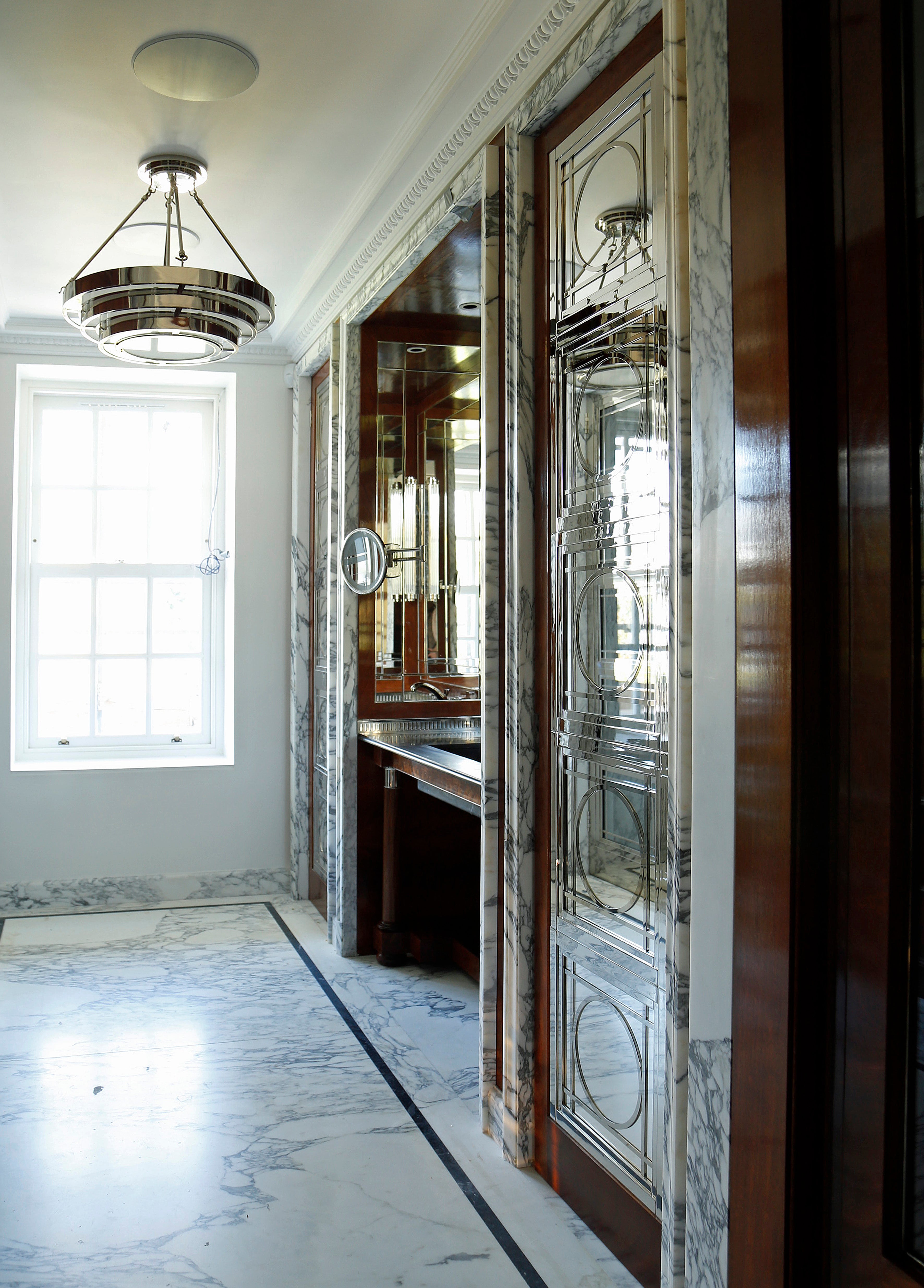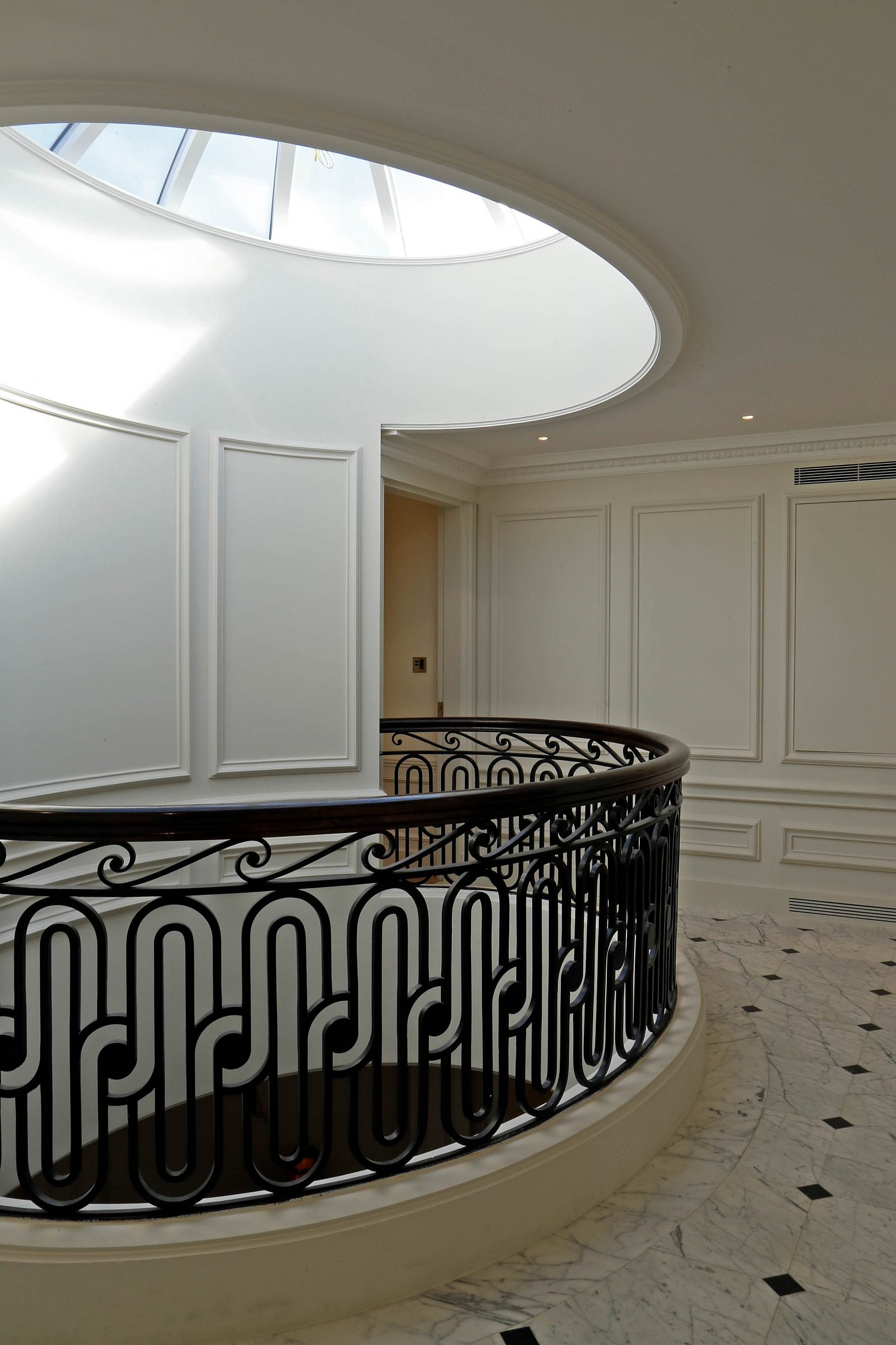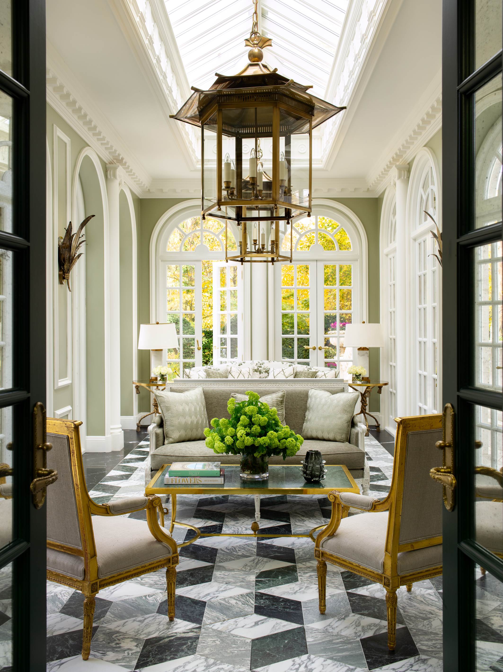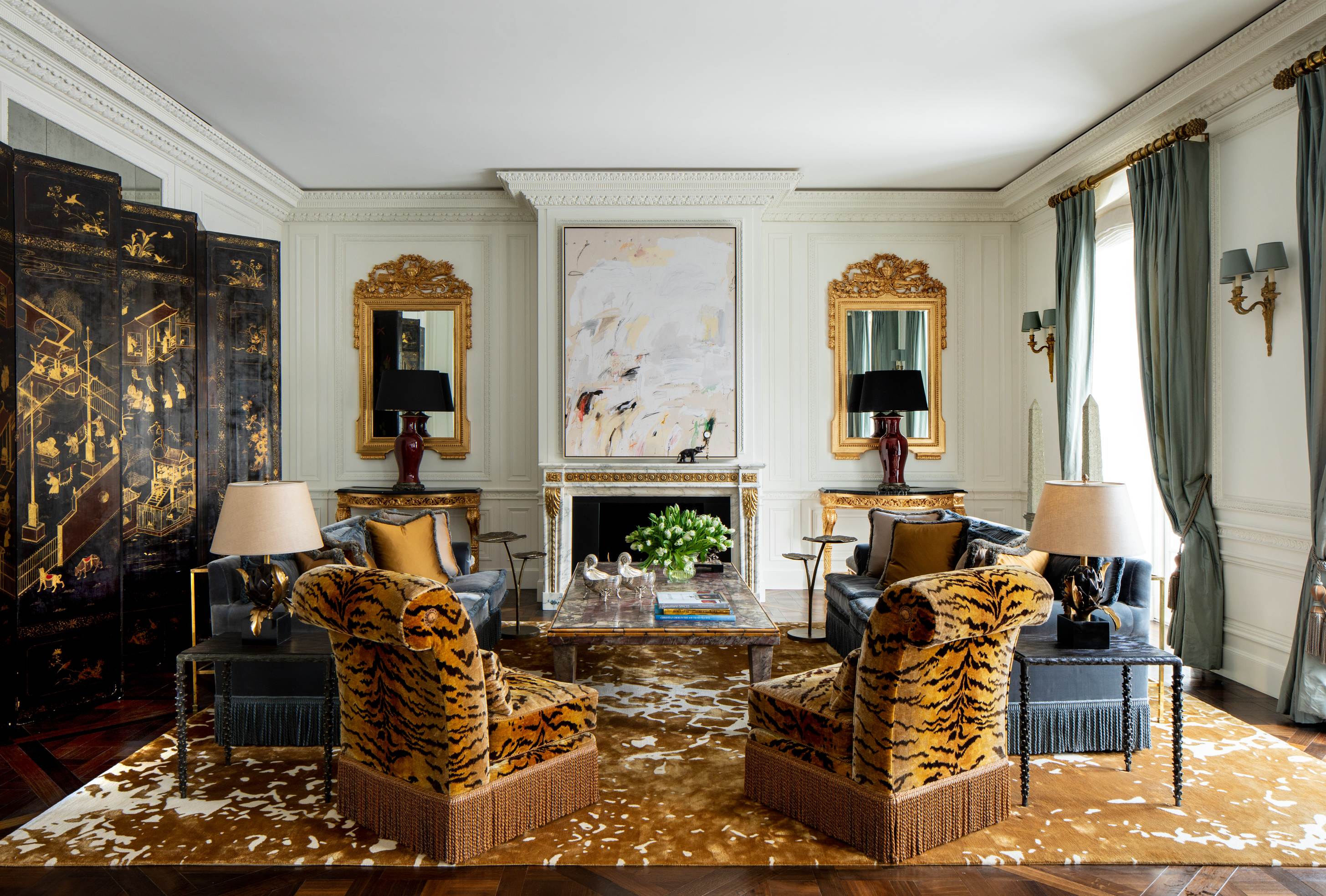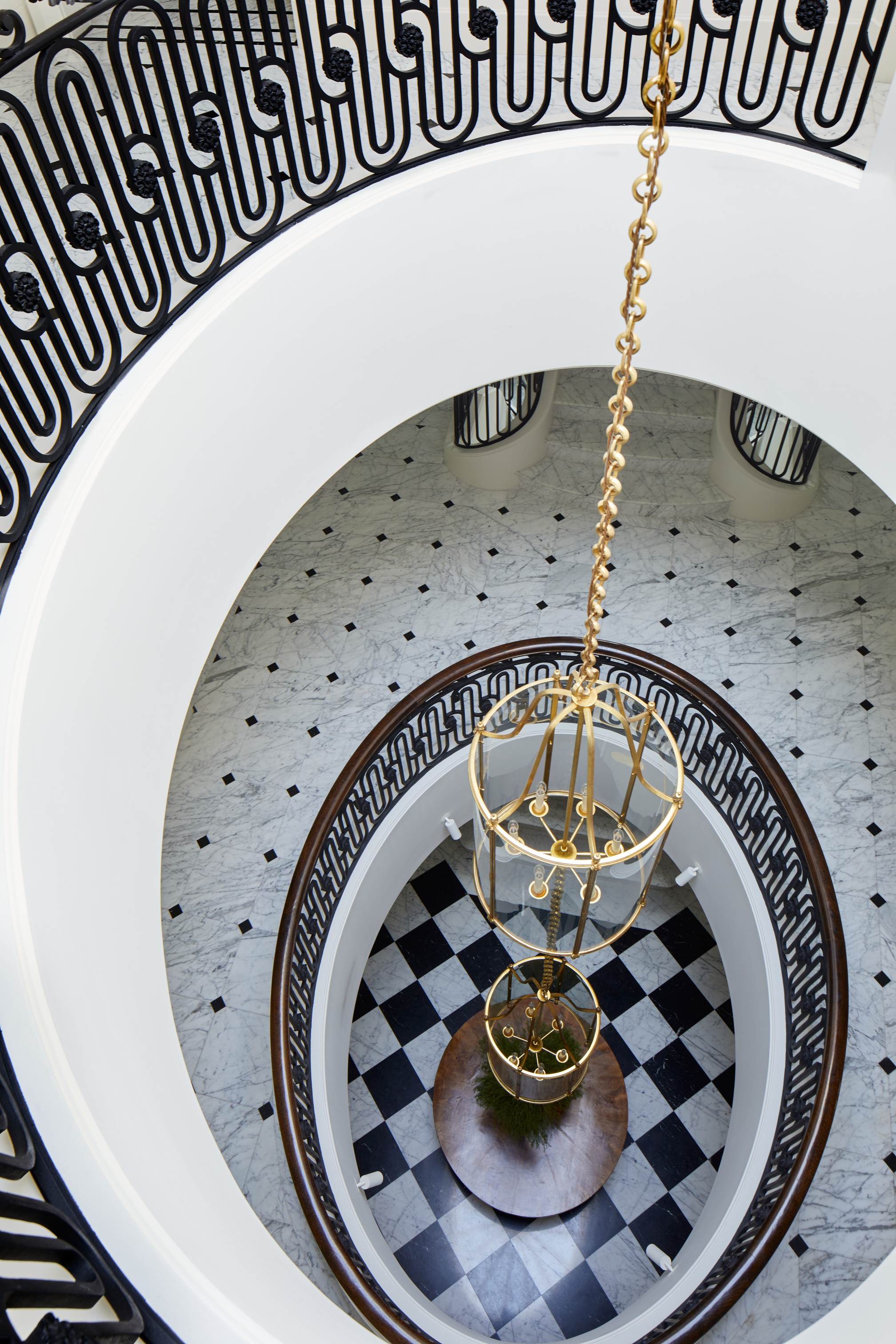 The owners of this magnificent property—a Georgian-style mansion that is one of London’s largest private residences built during the past decade—commissioned Philip Vergeylen and our Design Studio to create interiors that would reflect the grandeur of the estate. With a design brief for “more-is-more” opulence, the Studio focused on luxurious materials and exquisite craftsmanship to create bold, dramatic room settings with sumptuous details. A myriad of sources provided inspiration—the sun-splashed breakfast room recalls the pale green palette of the patisserie Ladurée; a Hong Kong restaurant created by Sir David Tang sparked the Chinese Art Deco–style games room; the library, inset with Coromandel-and-gilt panels inspired by Coco Chanel’s iconic Rue Cambon apartment, is lacquered a deep aubergine, the client’s favourite colour; and one of the four dining rooms references the deep emerald green of couturier Hubert de Givenchy’s storied drawing room in Paris. The luxurious bedroom suites feature dazzling bathrooms, tufted velvet sofas beckon in the screening room, and the pristine indoor pool is steps from an elegant sitting area furnished in classic rattan and a crisp blue-and-white chinoiserie print.