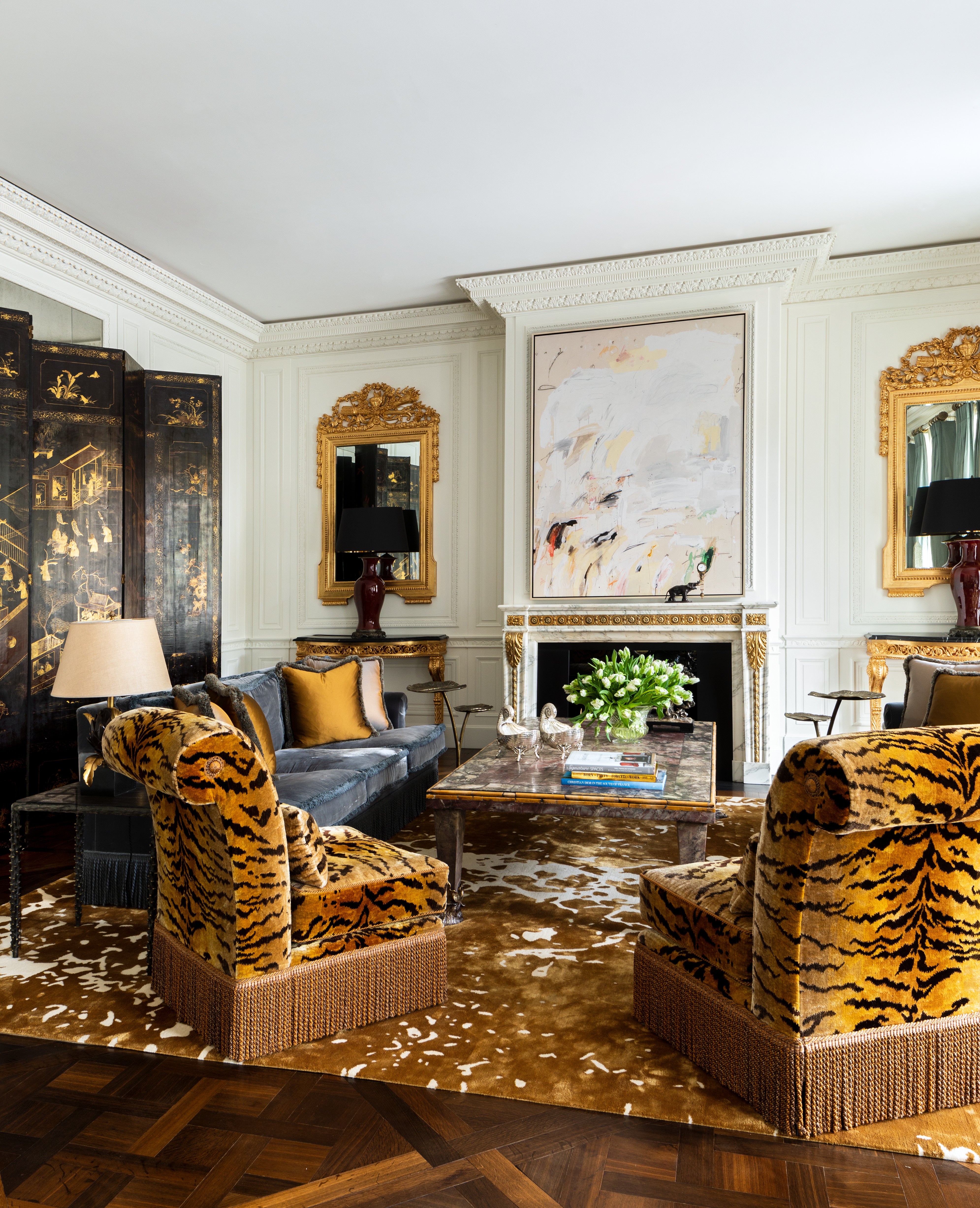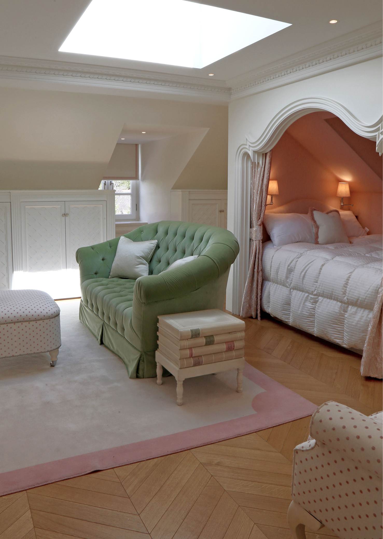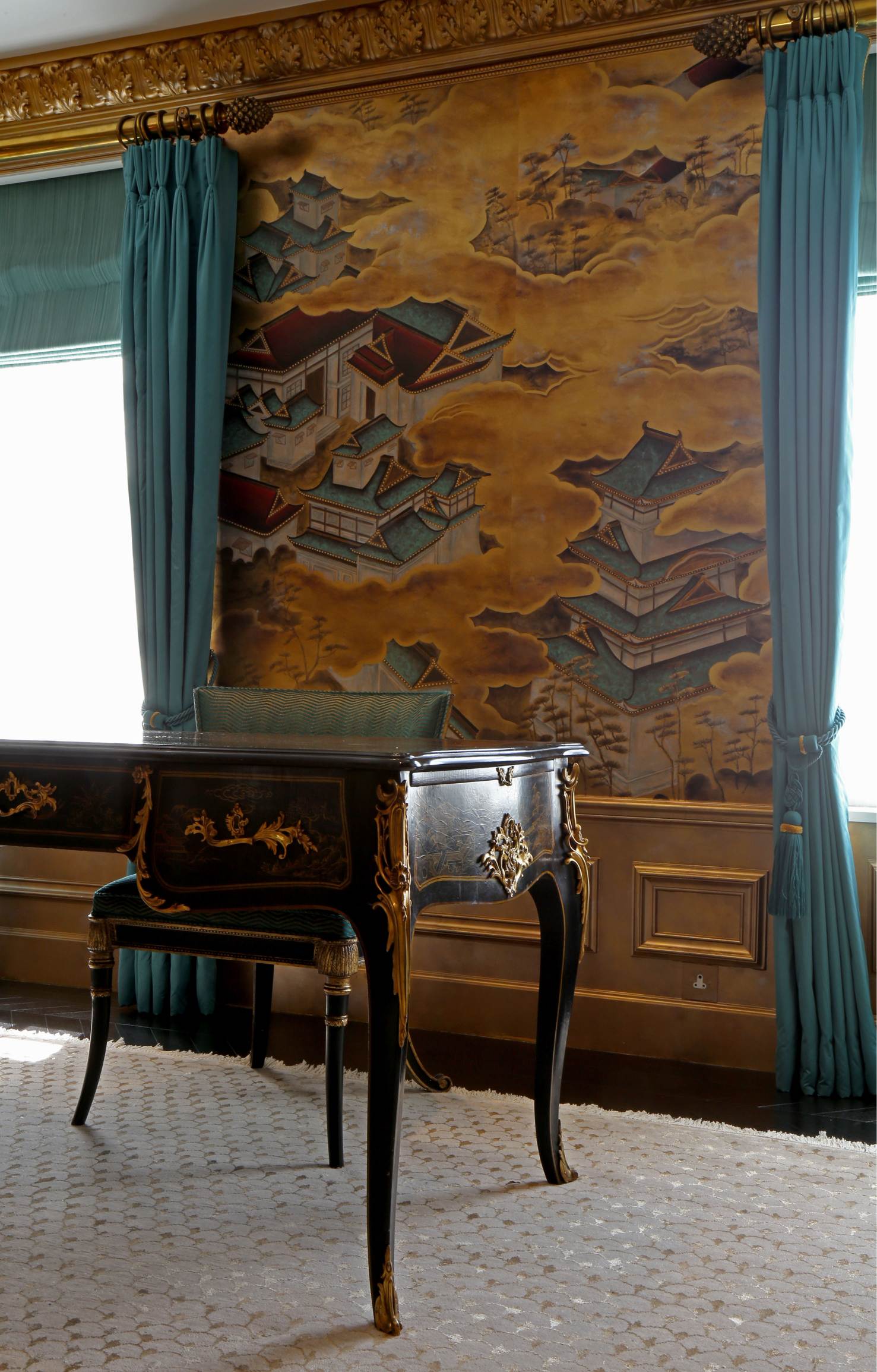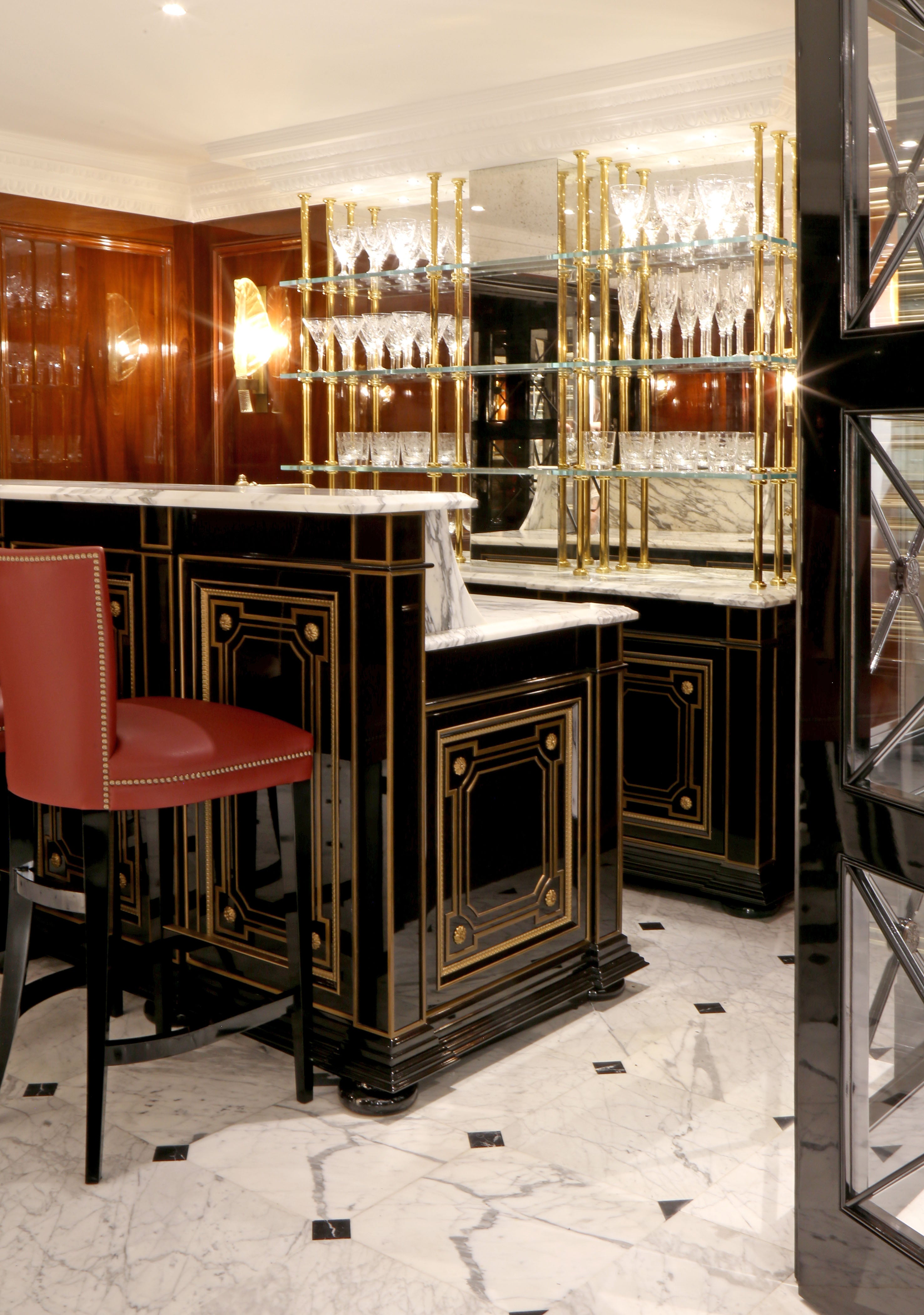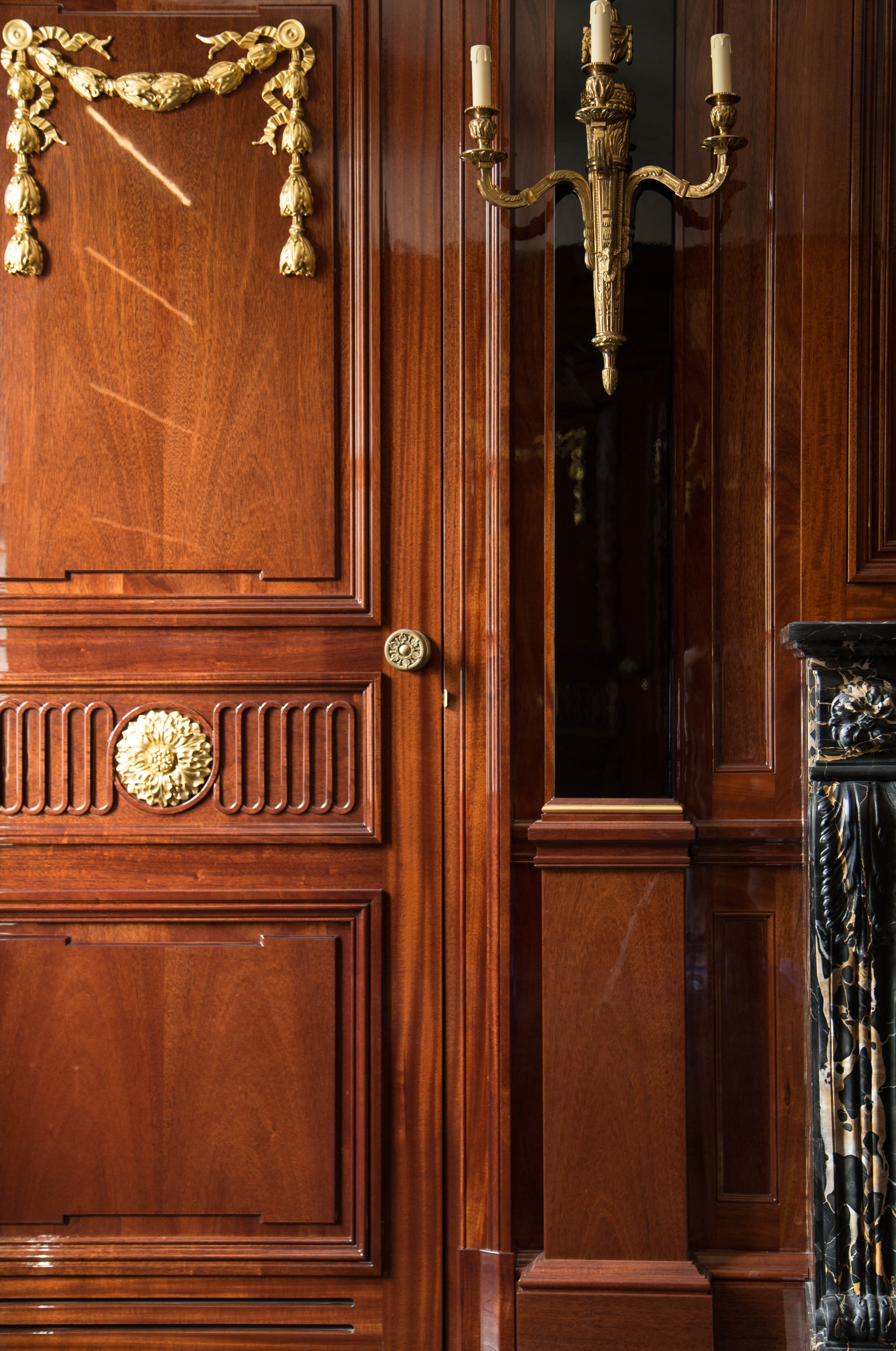 The owners of this magnificent property—a Georgian-style mansion that is one of London’s largest private residences built during the past decade—commissioned Philip Vergeylen and our Design Studio to create interiors that would reflect the grandeur of the estate. With a design brief for “more-is-more” opulence, the Studio focused on luxurious materials and exquisite craftsmanship to create bold, dramatic room settings with sumptuous details. A myriad of sources provided inspiration—the sun-splashed breakfast room recalls the pale green palette of the patisserie Ladurée; a Hong Kong restaurant created by Sir David Tang sparked the Chinese Art Deco–style games room; the library, inset with Coromandel-and-gilt panels inspired by Coco Chanel’s iconic Rue Cambon apartment, is lacquered a deep aubergine, the client’s favourite colour; and one of the four dining rooms references the deep emerald green of couturier Hubert de Givenchy’s storied drawing room in Paris. The luxurious bedroom suites feature dazzling bathrooms, tufted velvet sofas beckon in the screening room, and the pristine indoor pool is steps from an elegant sitting area furnished in classic rattan and a crisp blue-and-white chinoiserie print.