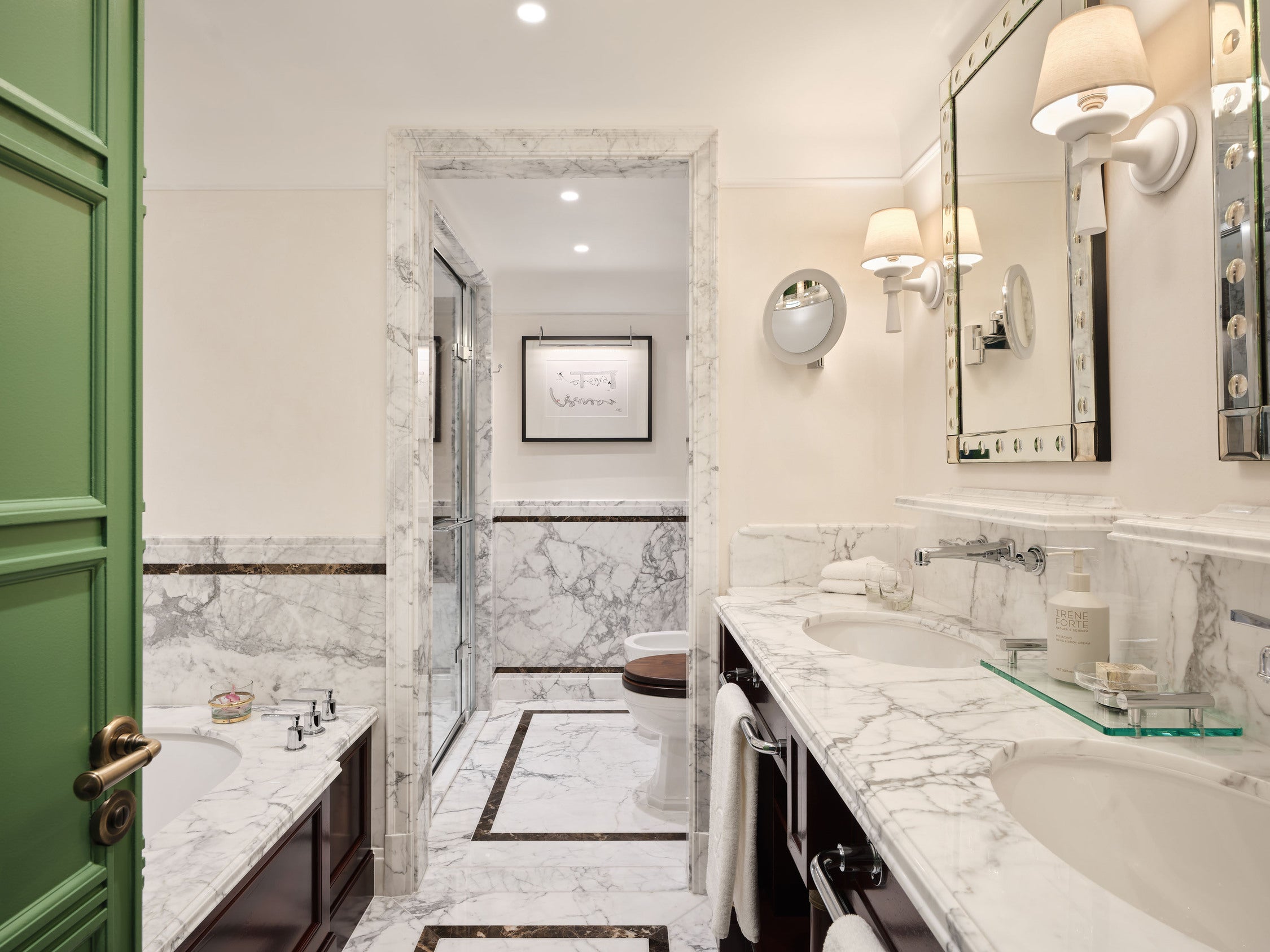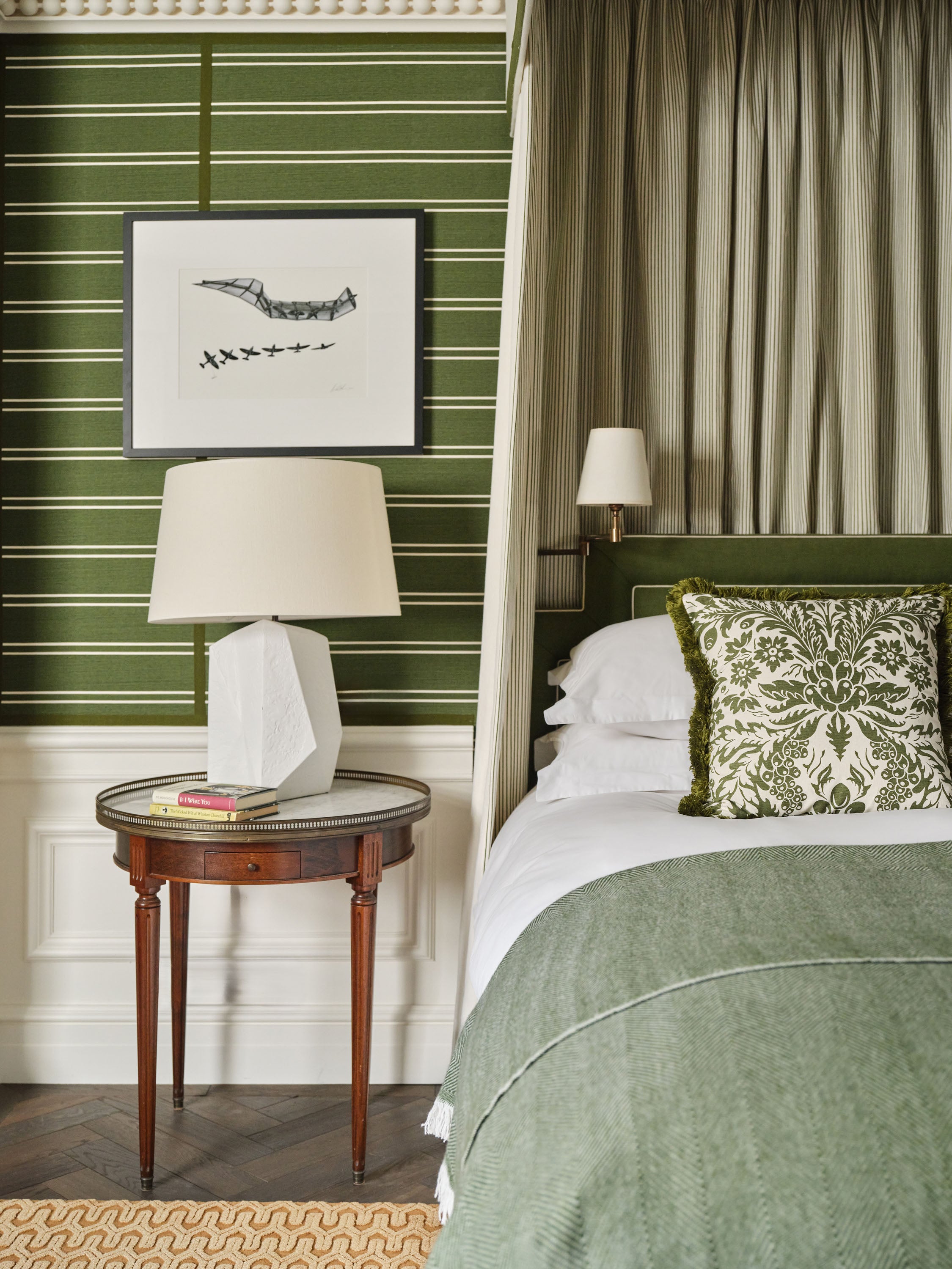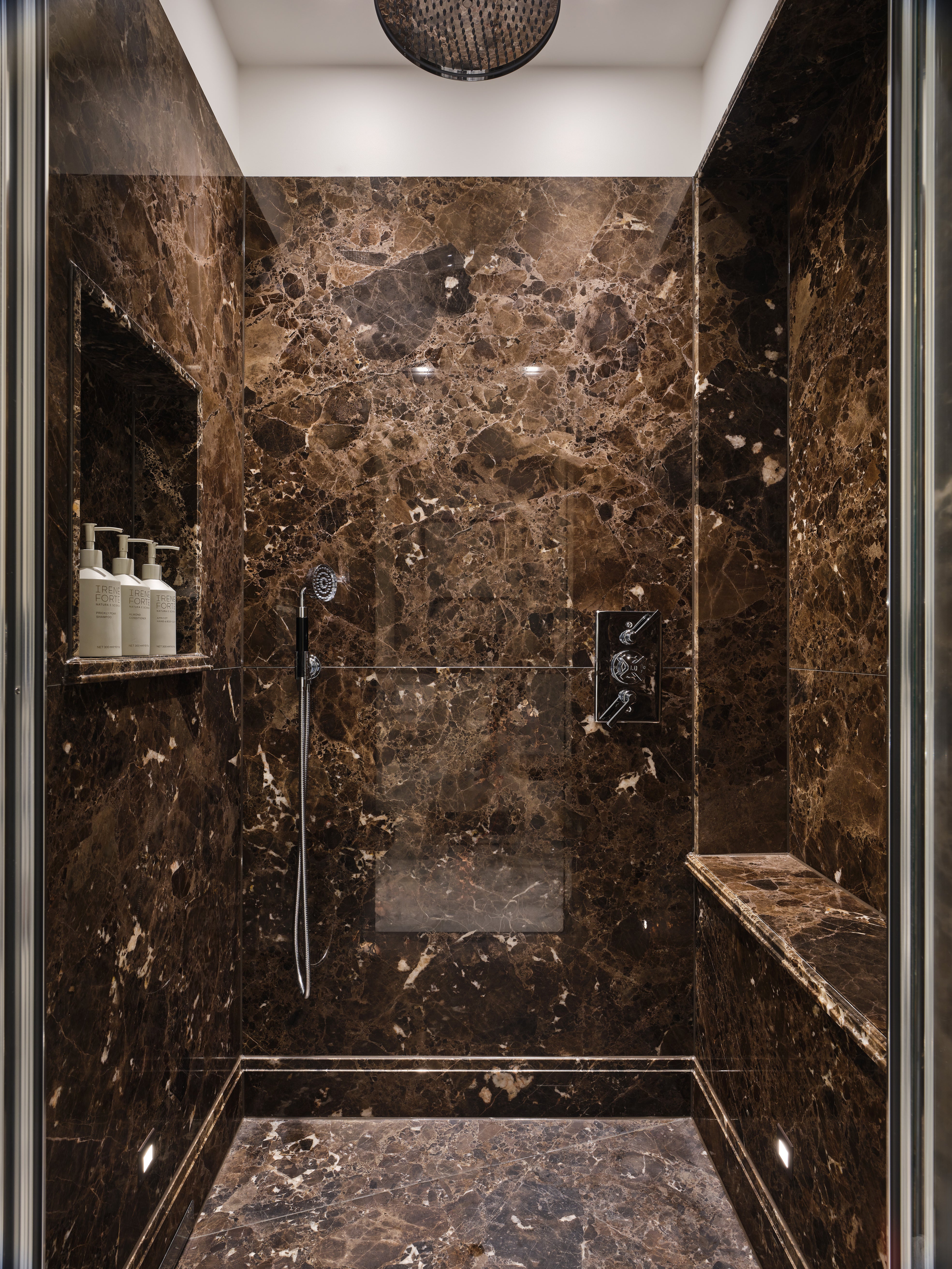 One suite is a verdant Mayfair retreat, built around a custom green derived from Farrow & Ball’s Calke Green. The second suite, accessed by a dramatic double staircase, centres on a contemporary Italian marble fireplace and an Emperador marble bathroom with a rare oversized porthole window framing London’s skyline.