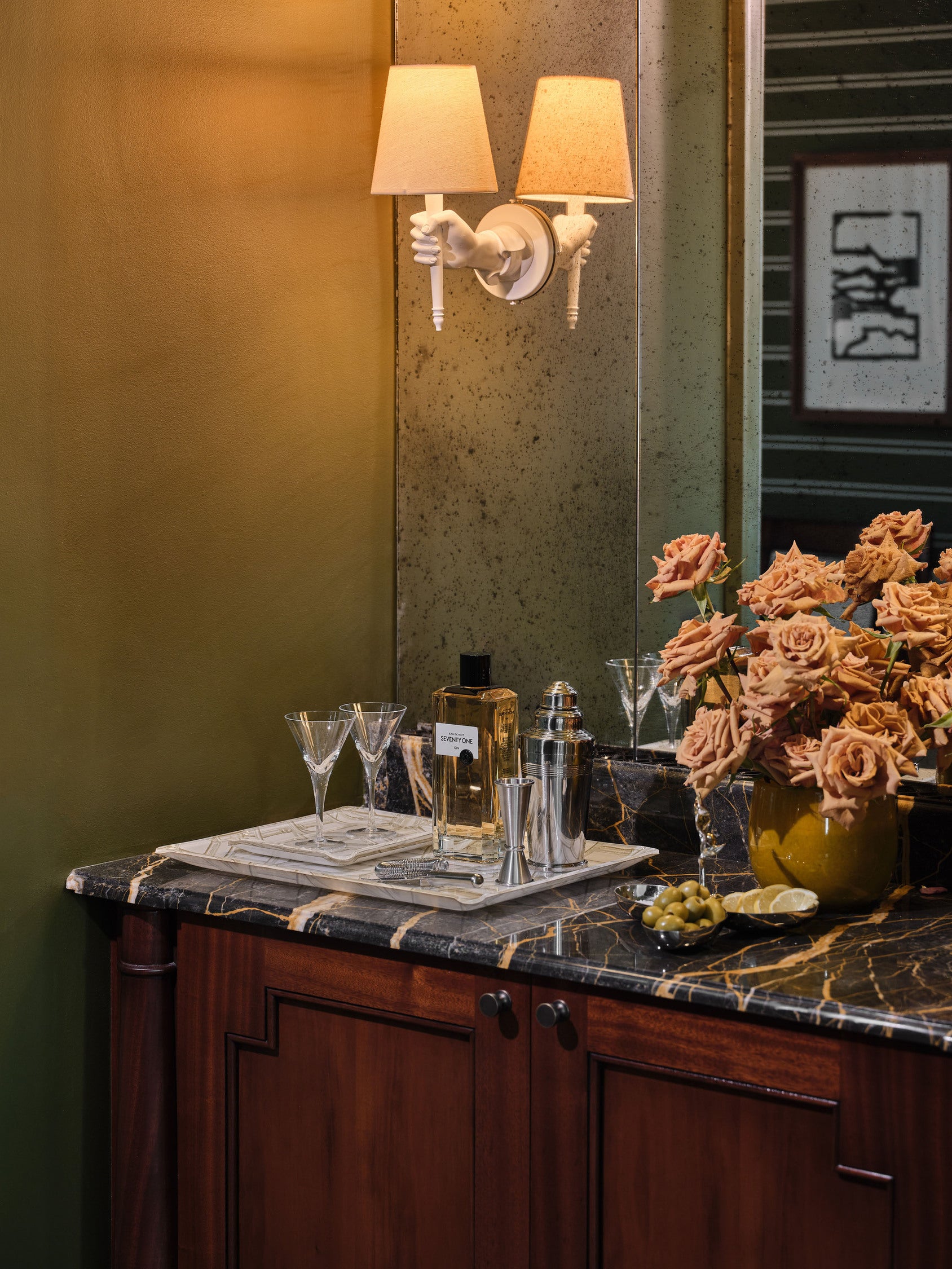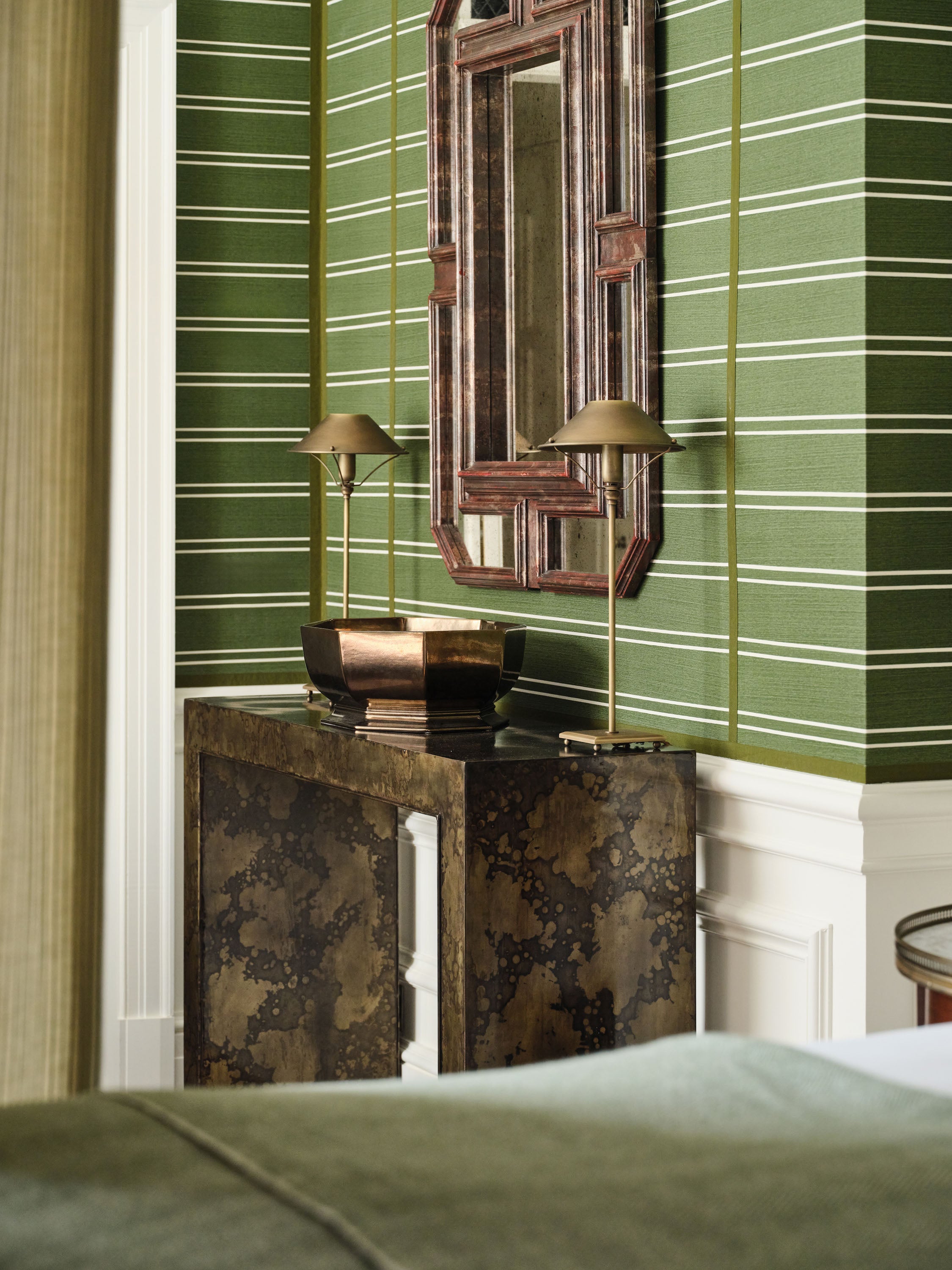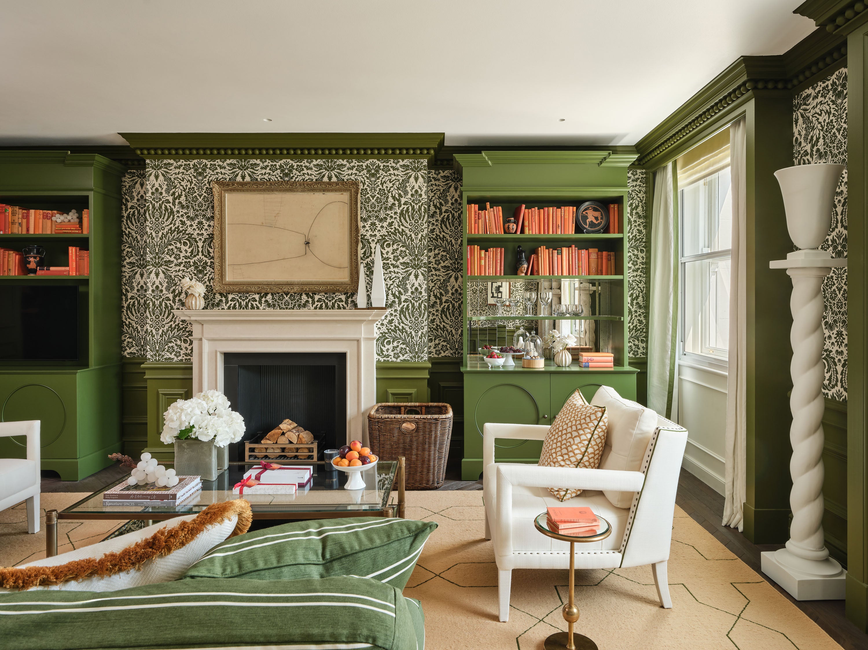 One suite is a verdant Mayfair retreat, built around a custom green derived from Farrow & Ball’s Calke Green. The second suite, accessed by a dramatic double staircase, centres on a contemporary Italian marble fireplace and an Emperador marble bathroom with a rare oversized porthole window framing London’s skyline.