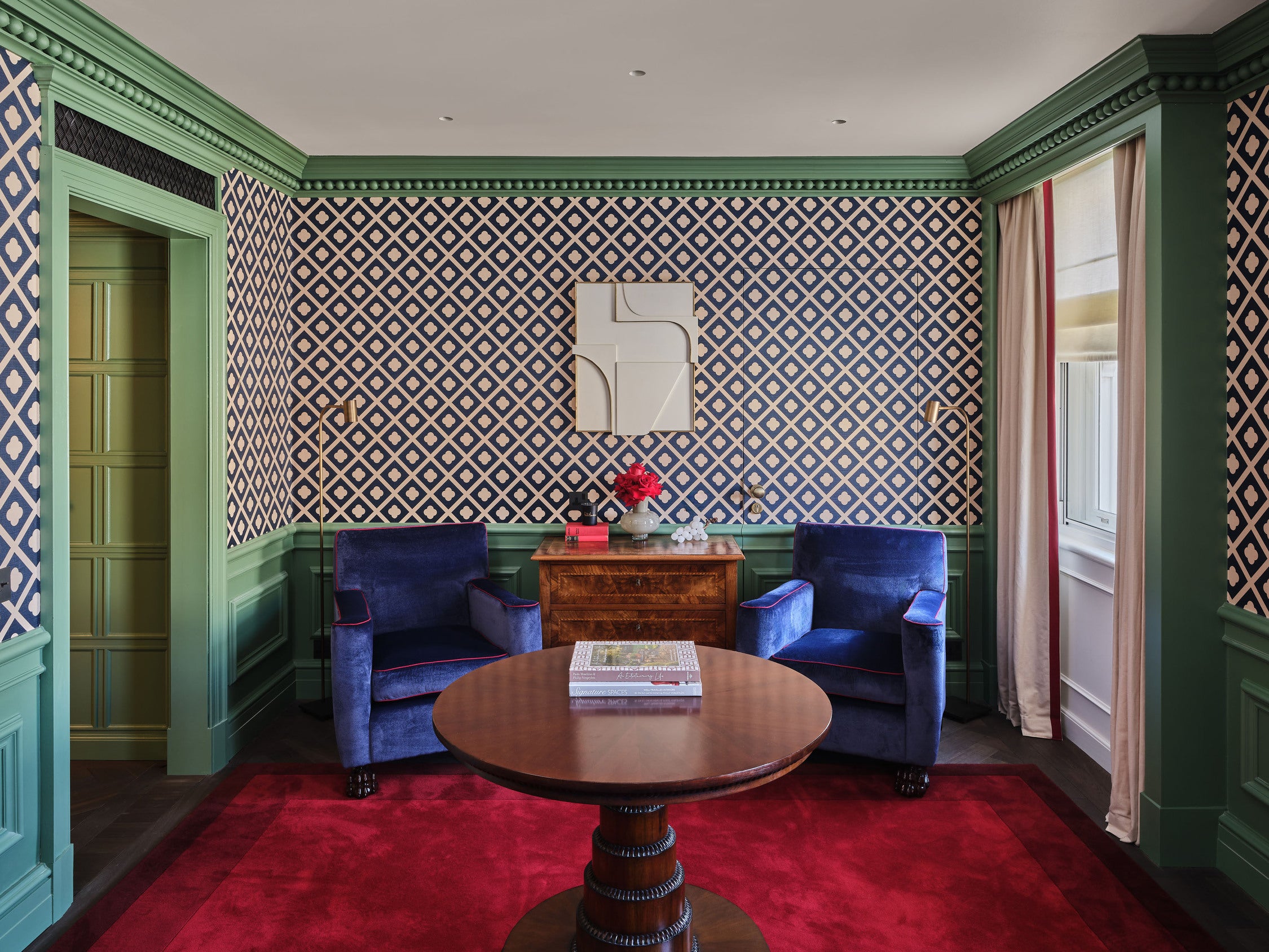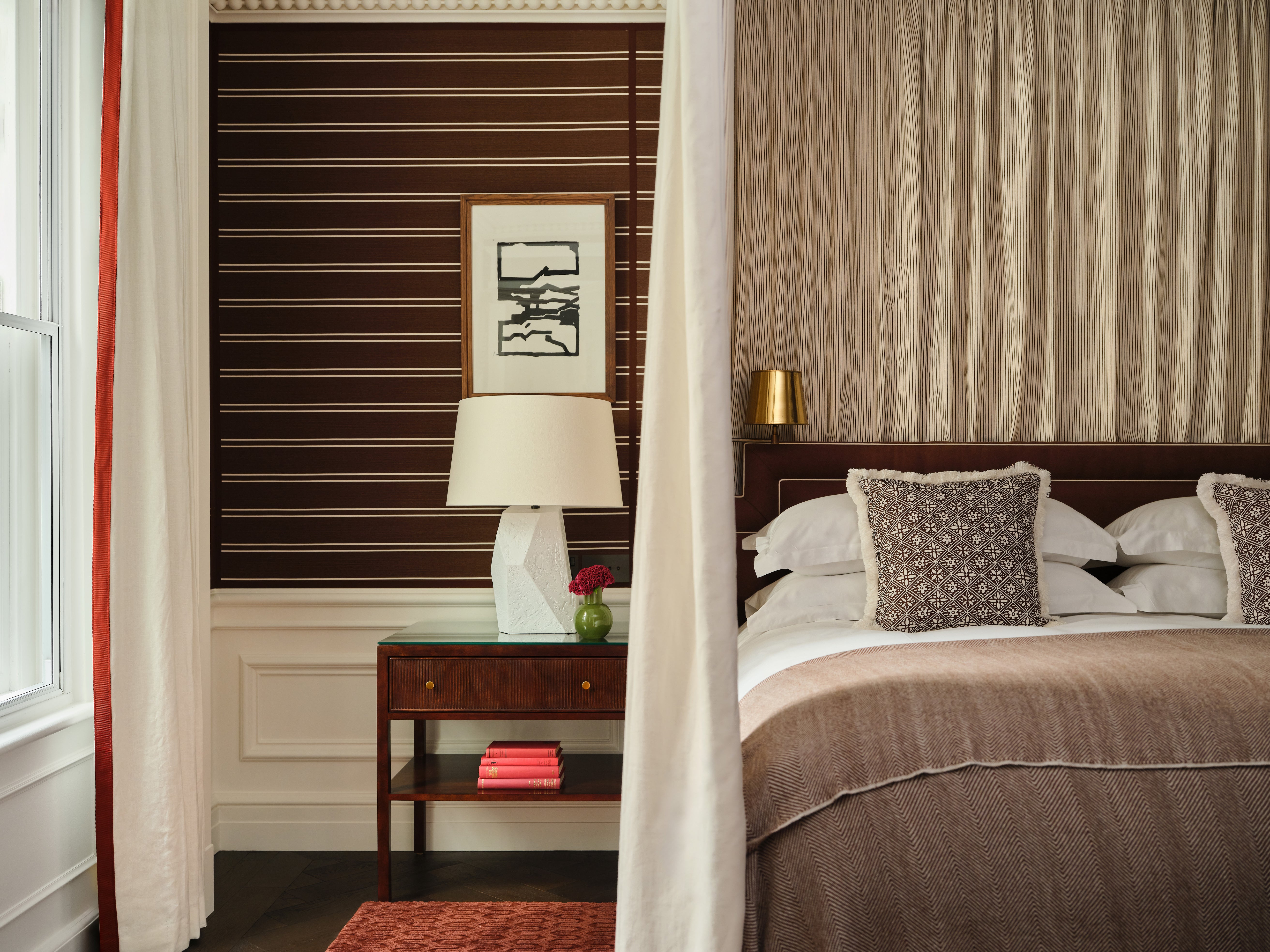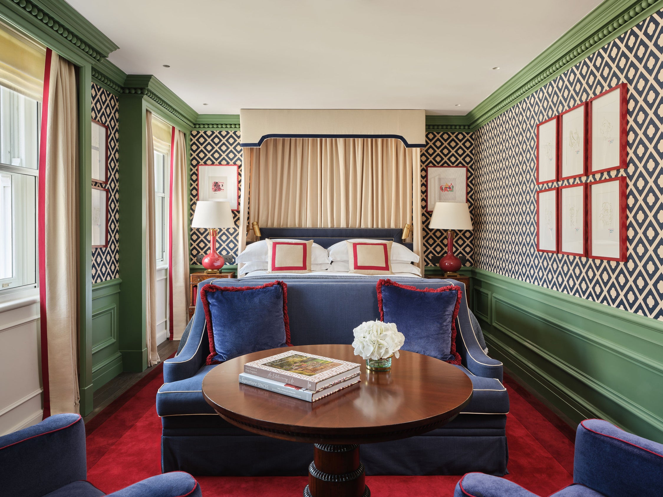 Each suite is an intimate sanctuary of craftsmanship, featuring handcrafted timber panelling and bespoke ironmongery, hidden doors inspired by Soane’s playful approach to space, curated antiquities sourced across Britain, and beautifully layered wallcoverings including bespoke hand-printed wallpaper by San Patrignano and fabric wallpapers by Paolo Moschino. Commissioned artworks framed in bold red borders add a striking editorial contrast throughout.