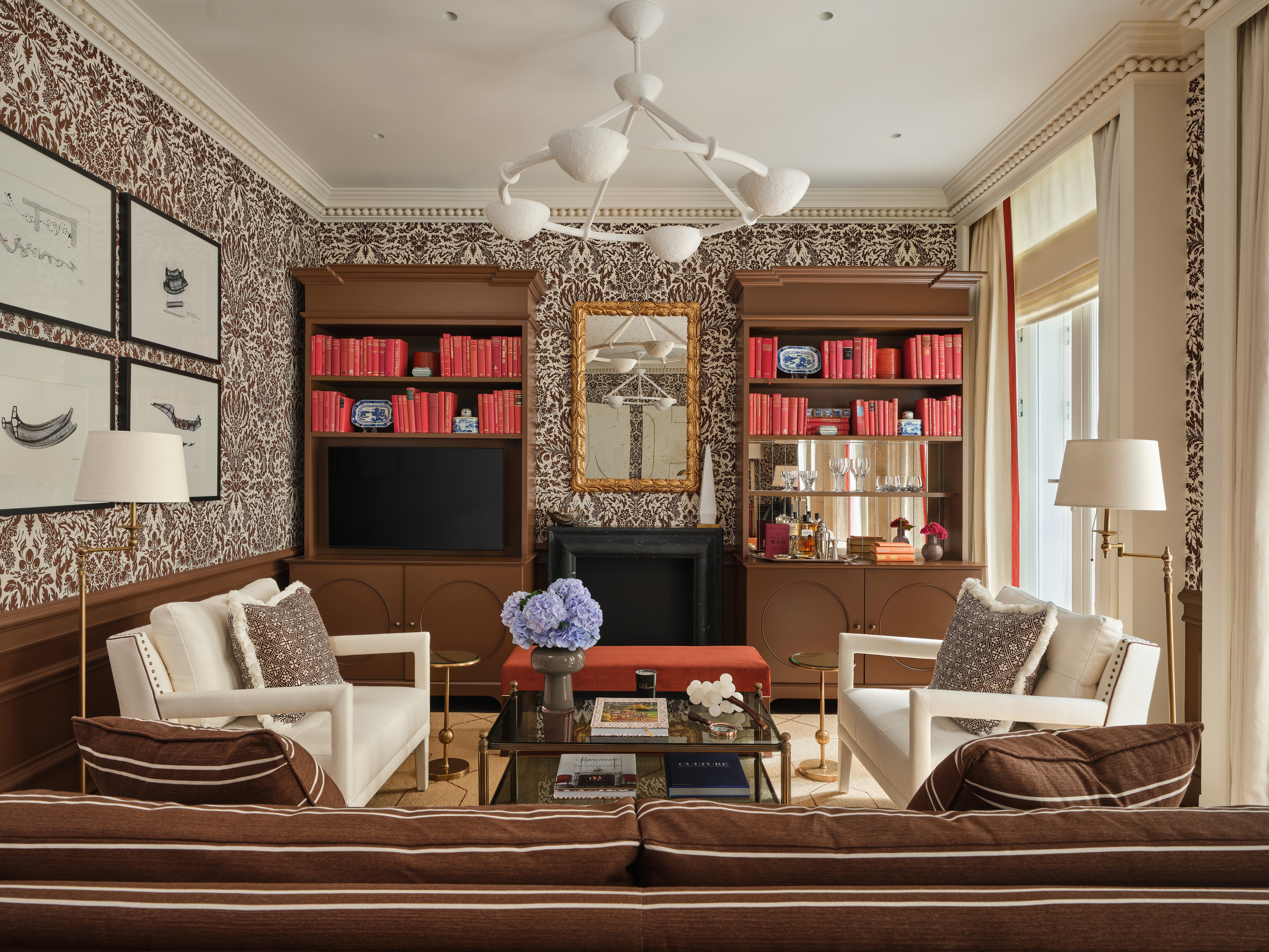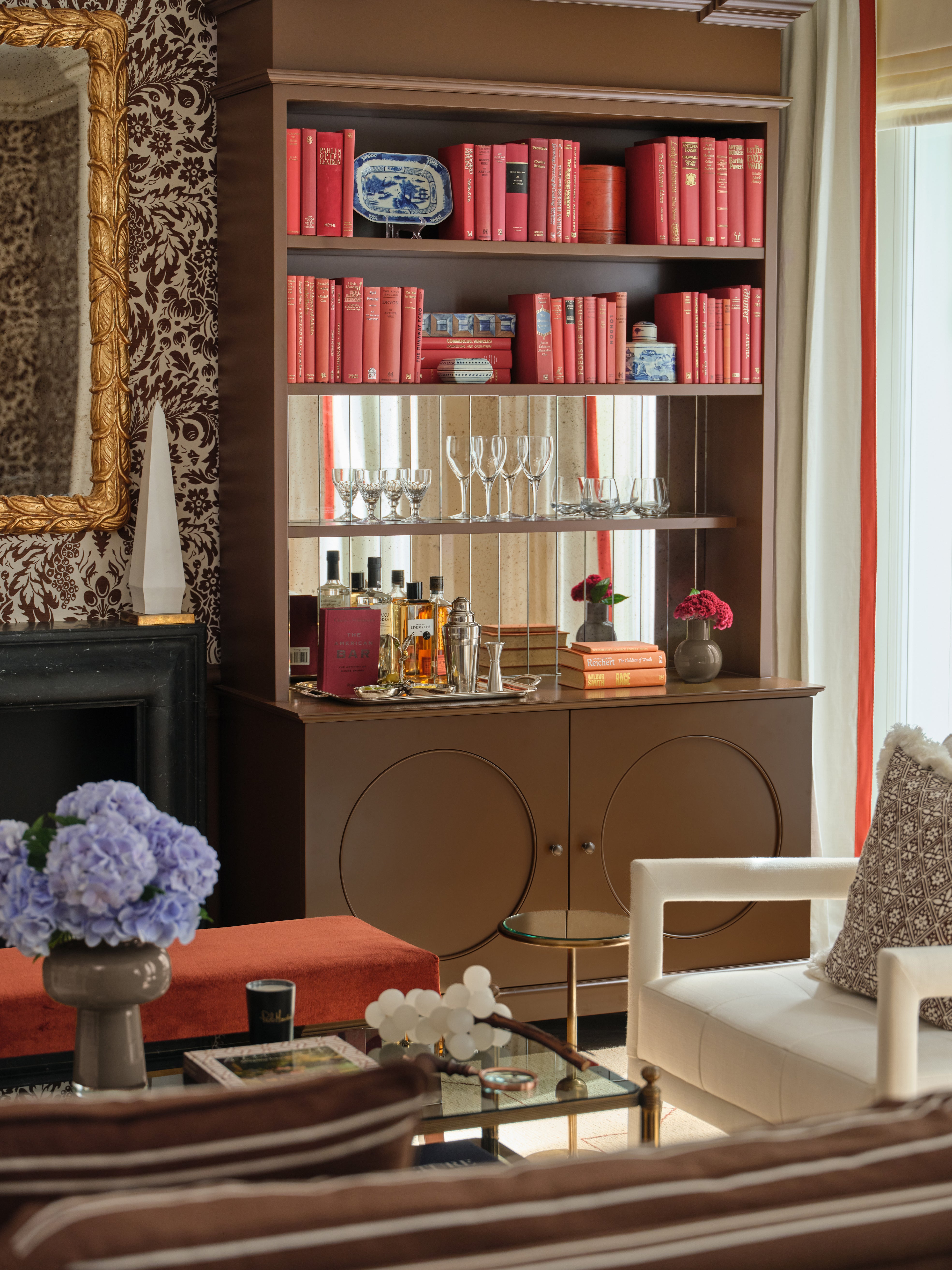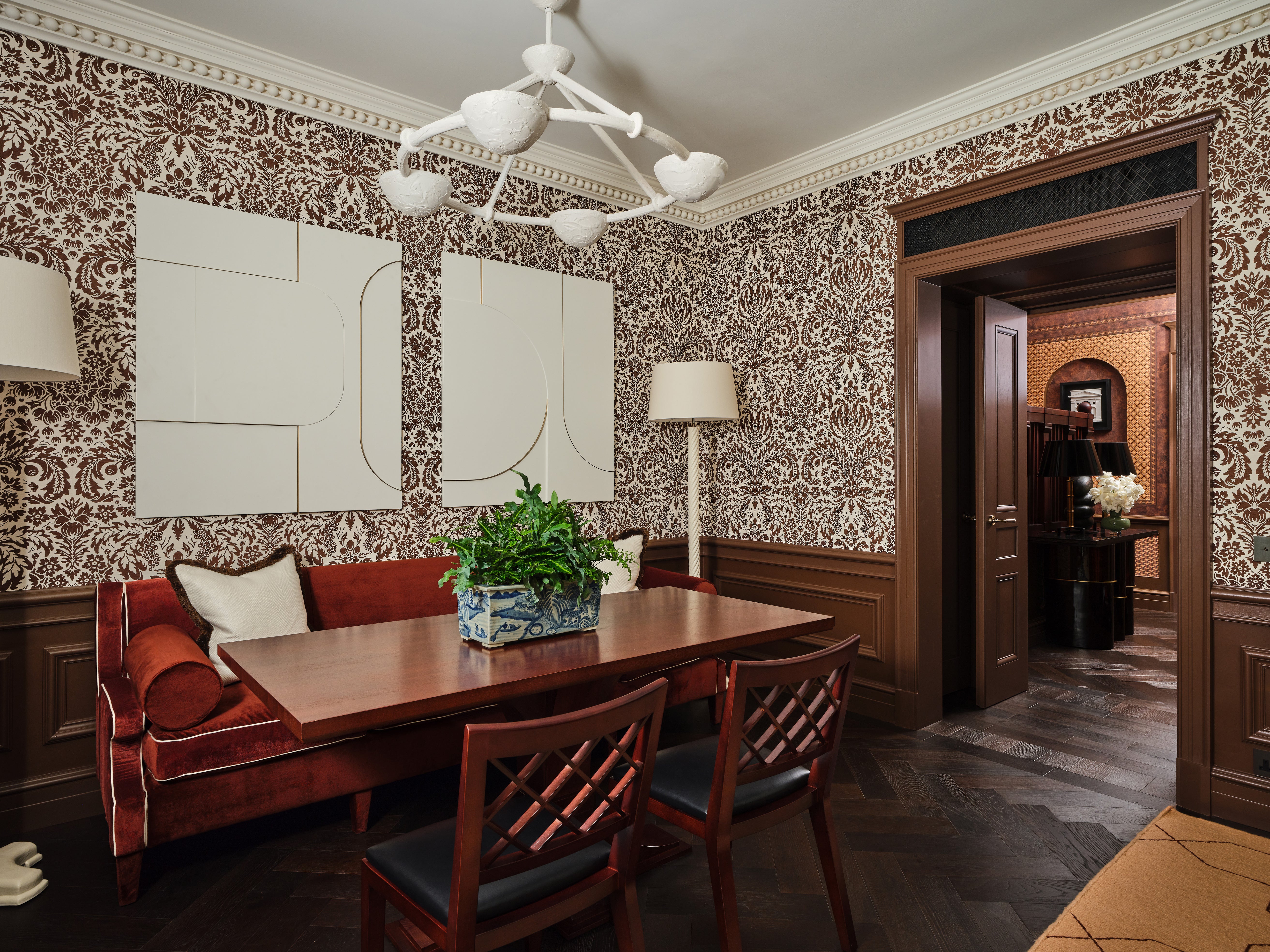 Each suite is an intimate sanctuary of craftsmanship, featuring handcrafted timber panelling and bespoke ironmongery, hidden doors inspired by Soane’s playful approach to space, curated antiquities sourced across Britain, and beautifully layered wallcoverings including bespoke hand-printed wallpaper by San Patrignano and fabric wallpapers by Paolo Moschino. Commissioned artworks framed in bold red borders add a striking editorial contrast throughout.