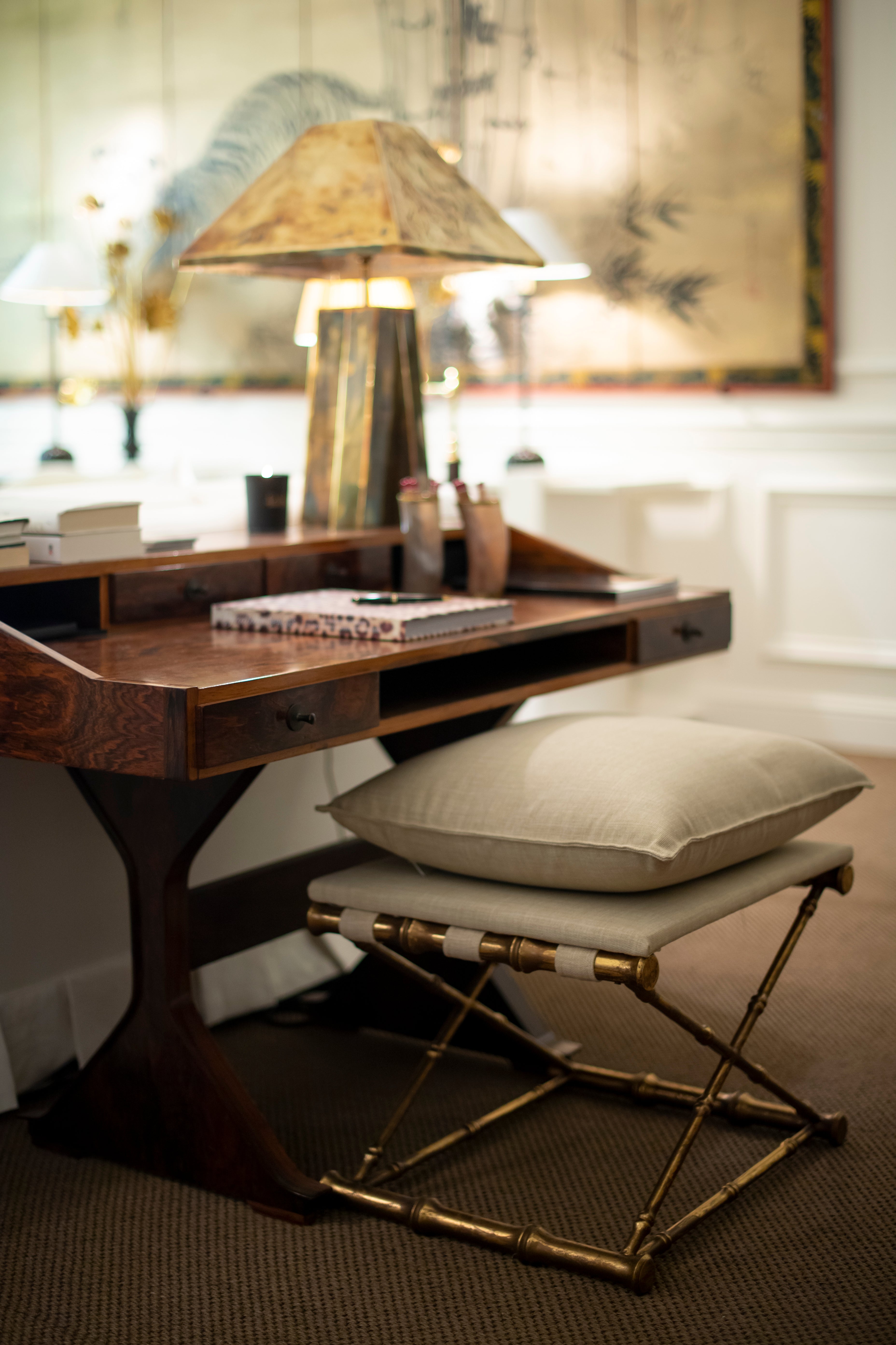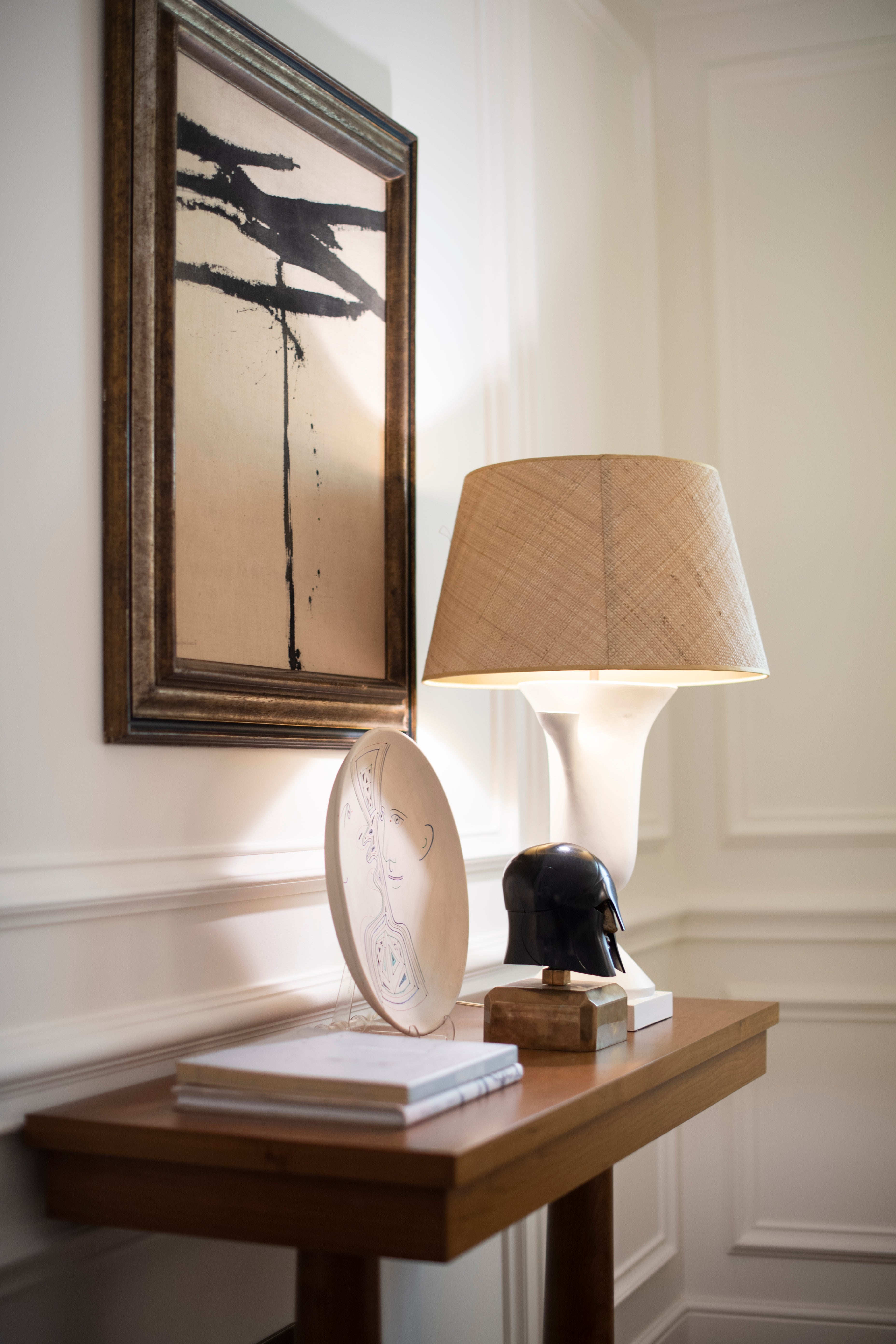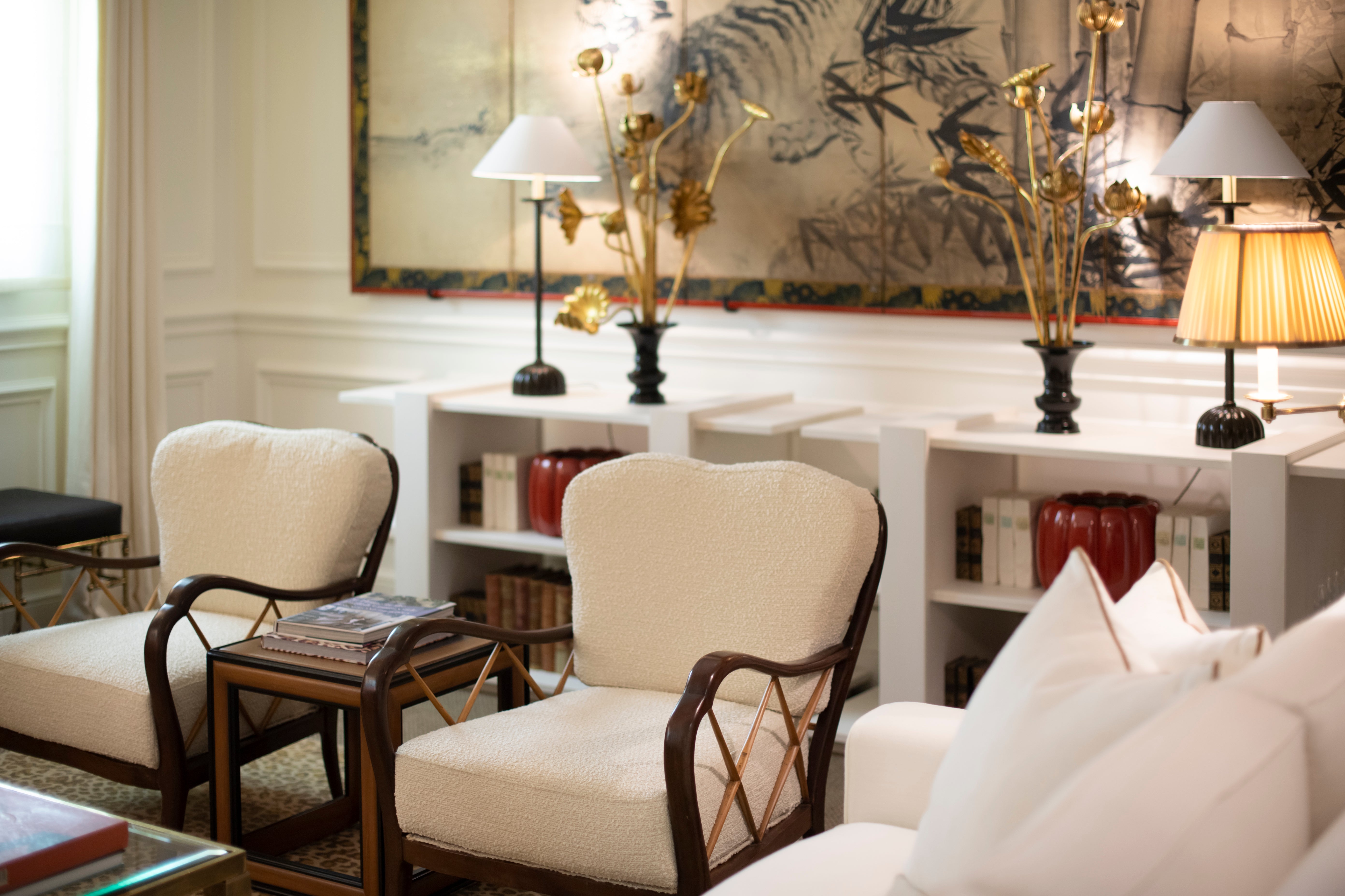 “We have tried to make the drawing room a typical room designed by our Company (classic with a twist). It has classic, strong architectural walls, a mixture of antiques (sourced from all over the world) and contemporary furniture, some (important!) work of art and a touch of humour. Without a final inhabitant, we have created a classic room that can be lived in by various generations comfortably and in style. We wanted the room to be both welcoming, calm, and well edited. A room where people are happy to stay. The aesthetic is fresh, clean, and very edited. The colour palette is white and chocolate brown with splashes of colour interspersed with a mixture of modern and antiques antiquities some oriental art. The fabrics are all-natural sustainable linen and wool."